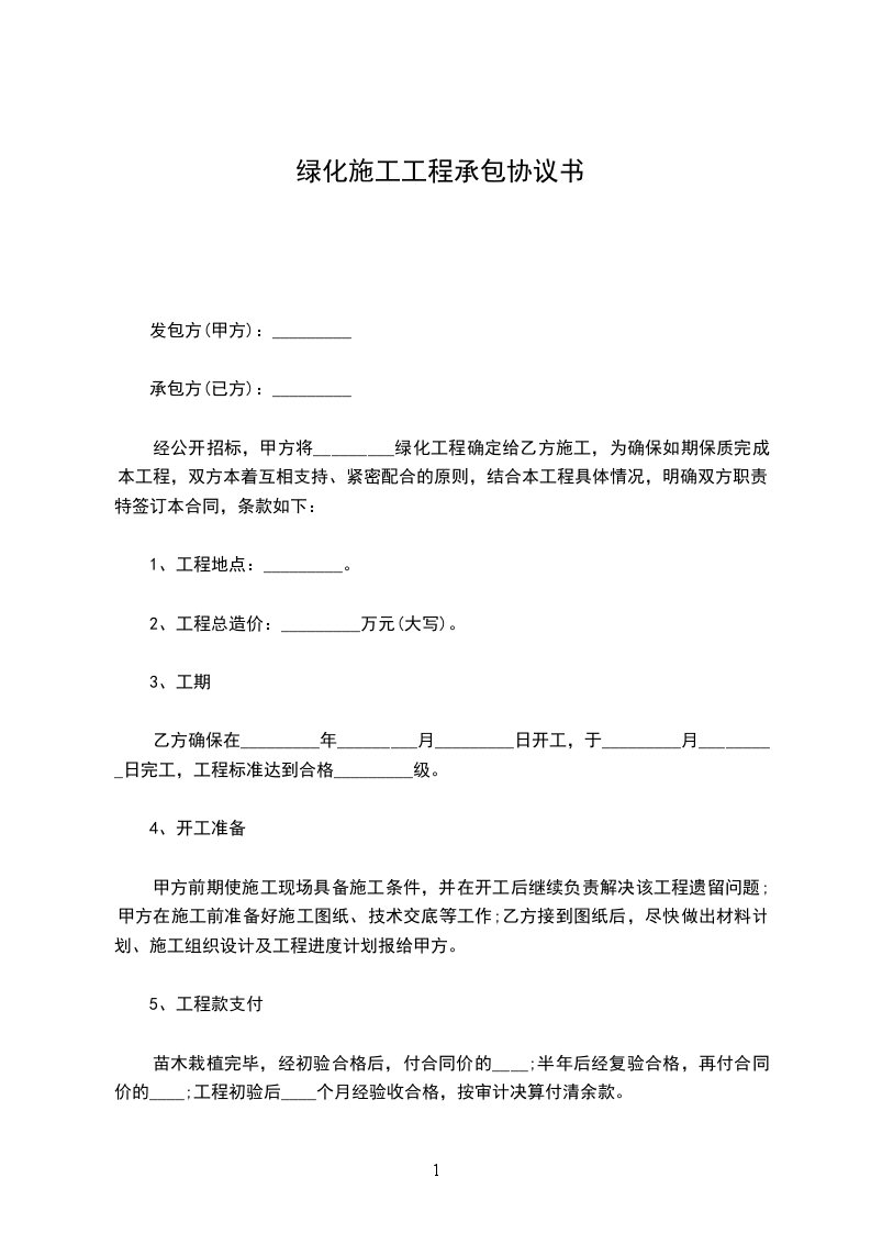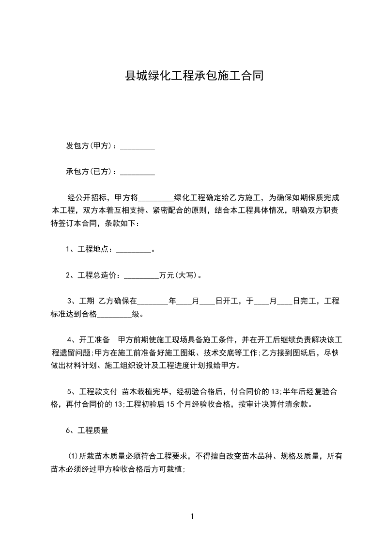 经公开招标,甲方将_________绿化工程确定给乙方施工,为确保如期保质完成本工程,双方本着互相支持、紧密配合的原则,结合本工程具体情况,明确双方职责,特签订本合同,条款如下: