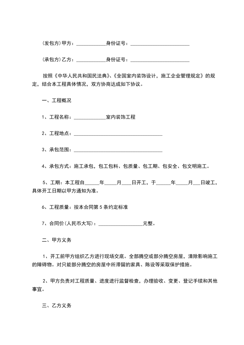 2)二次装饰工程,应全部腾空或部分腾空房屋,清除影响施工的障碍物。对只能部分腾空的房屋中所滞留的家具、陈设物等,须采取必要的保护措施,均需与乙方办理手续和承担费用。