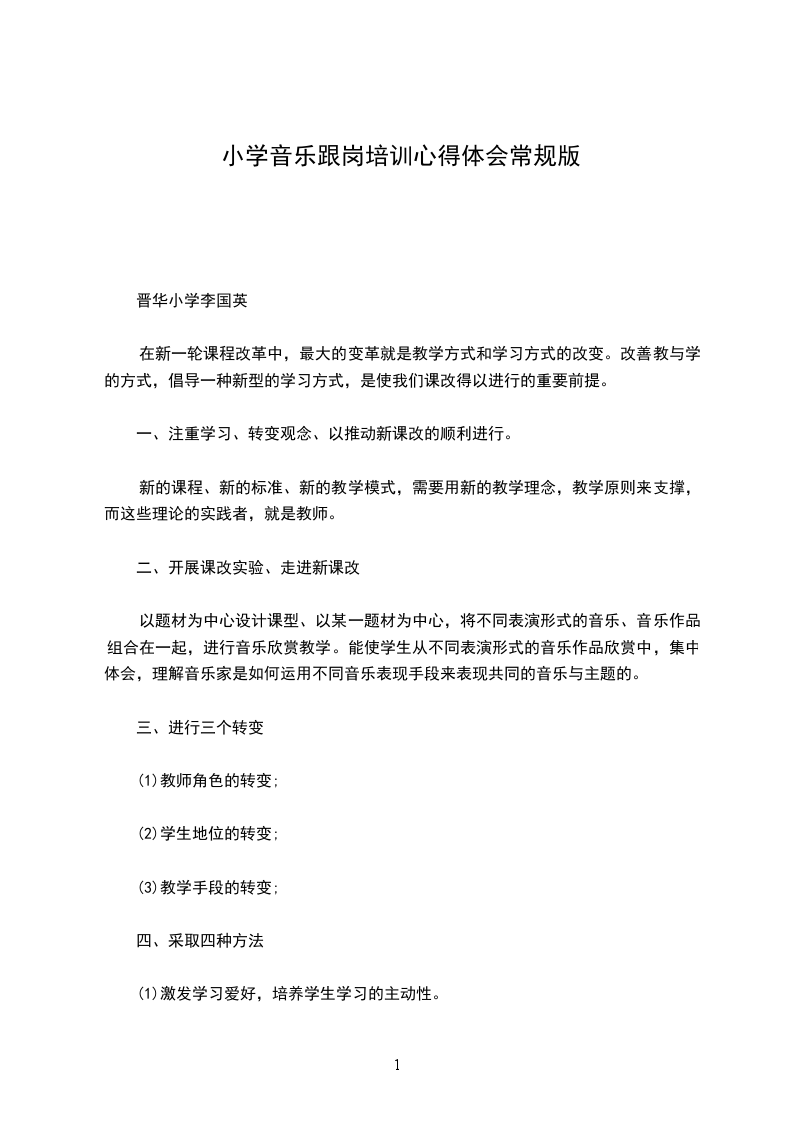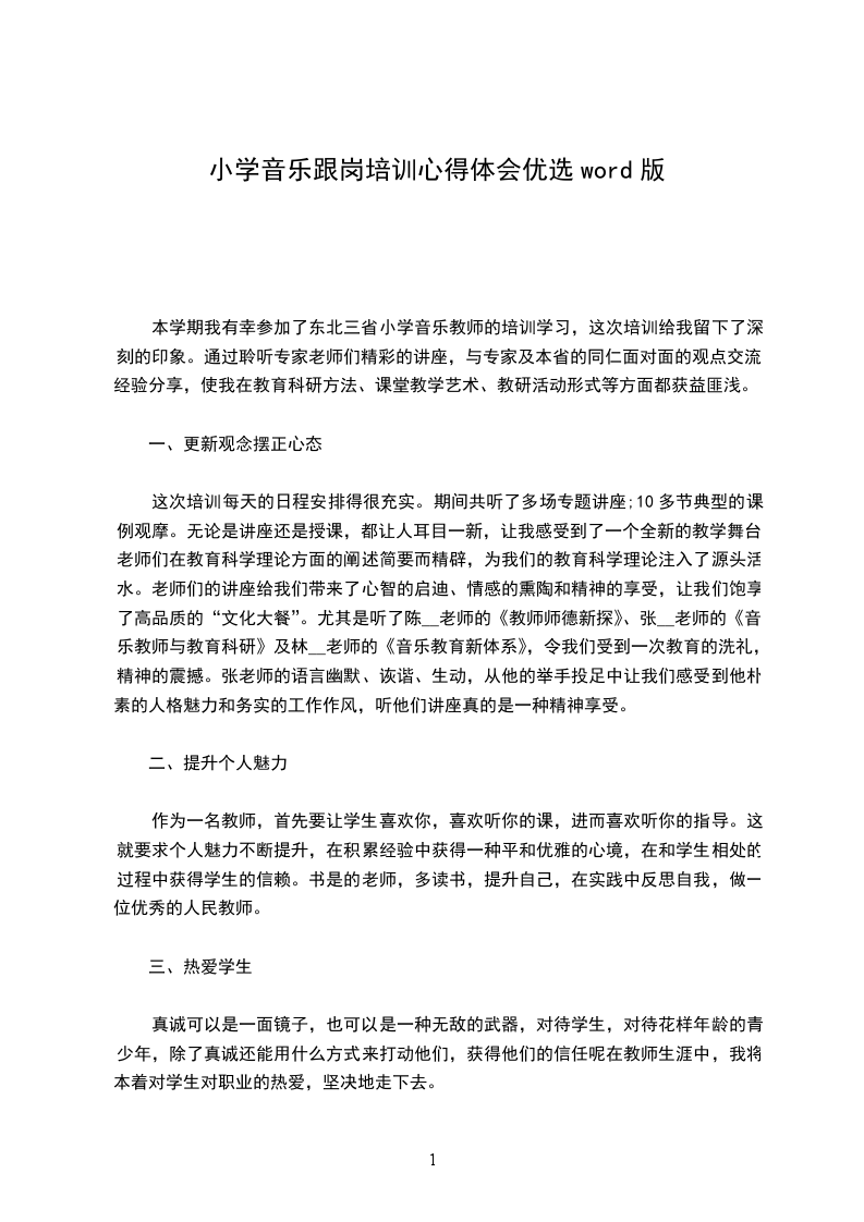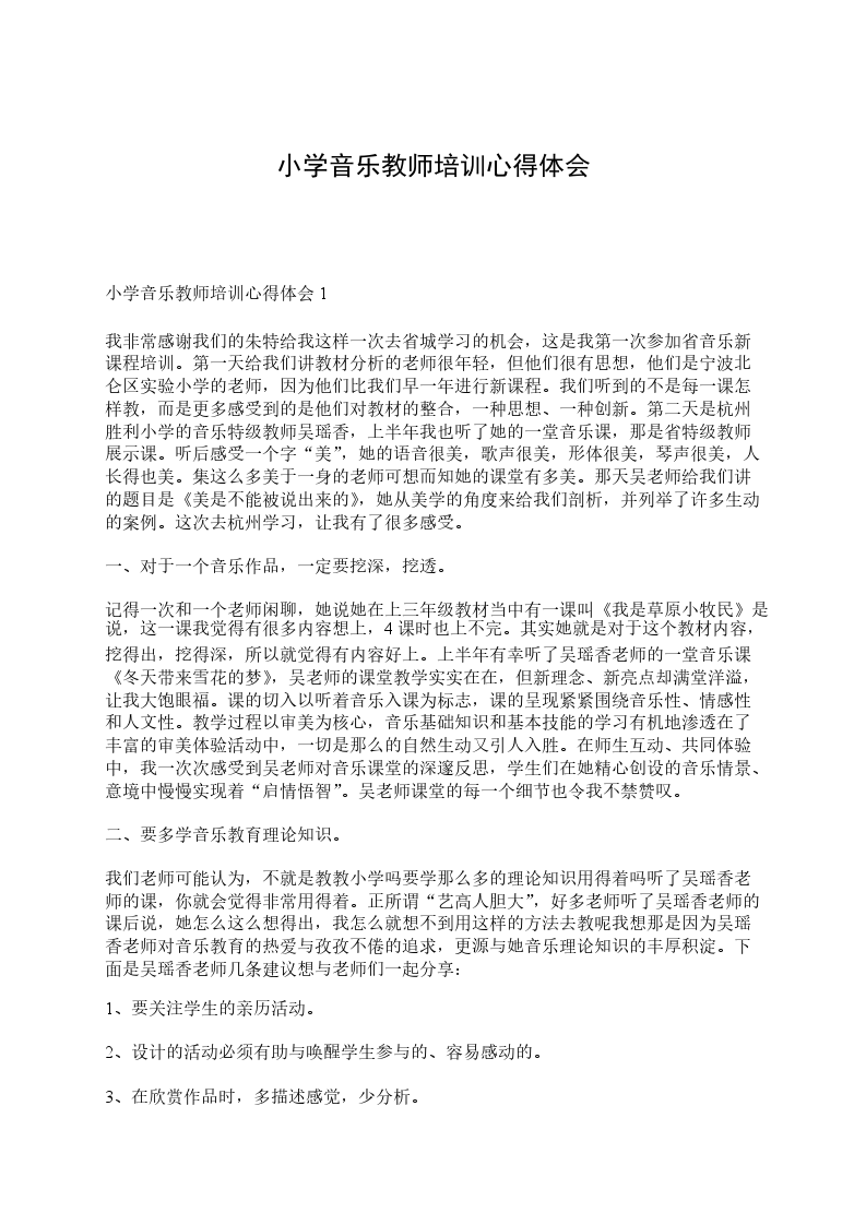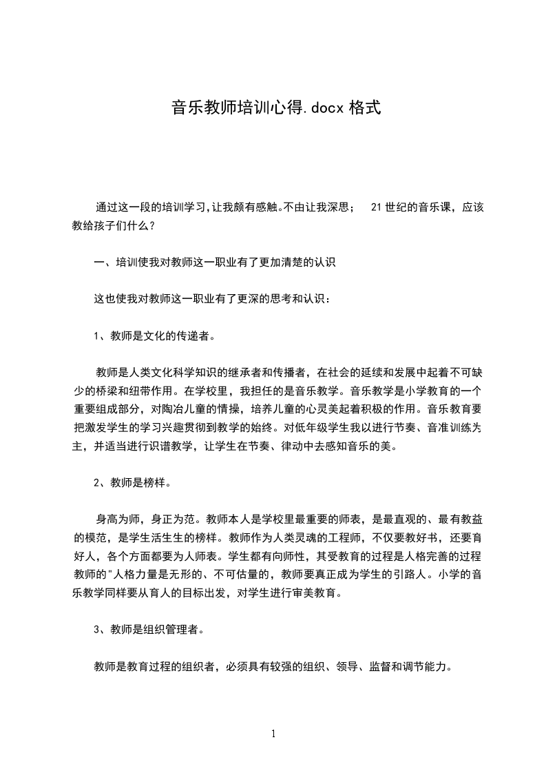 培训是一个反思进步的过程。二十天的培训学习是短暂而辛苦的,但留给我们的记忆和思考却是永恒的。通过这次培训,我进一步提高了认识,理清了思路,学到了新的教学理念,找到了自身的差距和不足。我要把汲取到的先进理念、思想运用到工作中去,让此次培训的价值在工作中得到最大的体现。作为一名音乐教师,我们要努力发挥自己的专业素质,把爱与知识播送给每一位孩子,让他们健康、个性地成长。使用各种教学方法,让学生去感受、理解、表现音乐;给他们富于旋律的人生,享受人生的旋律。