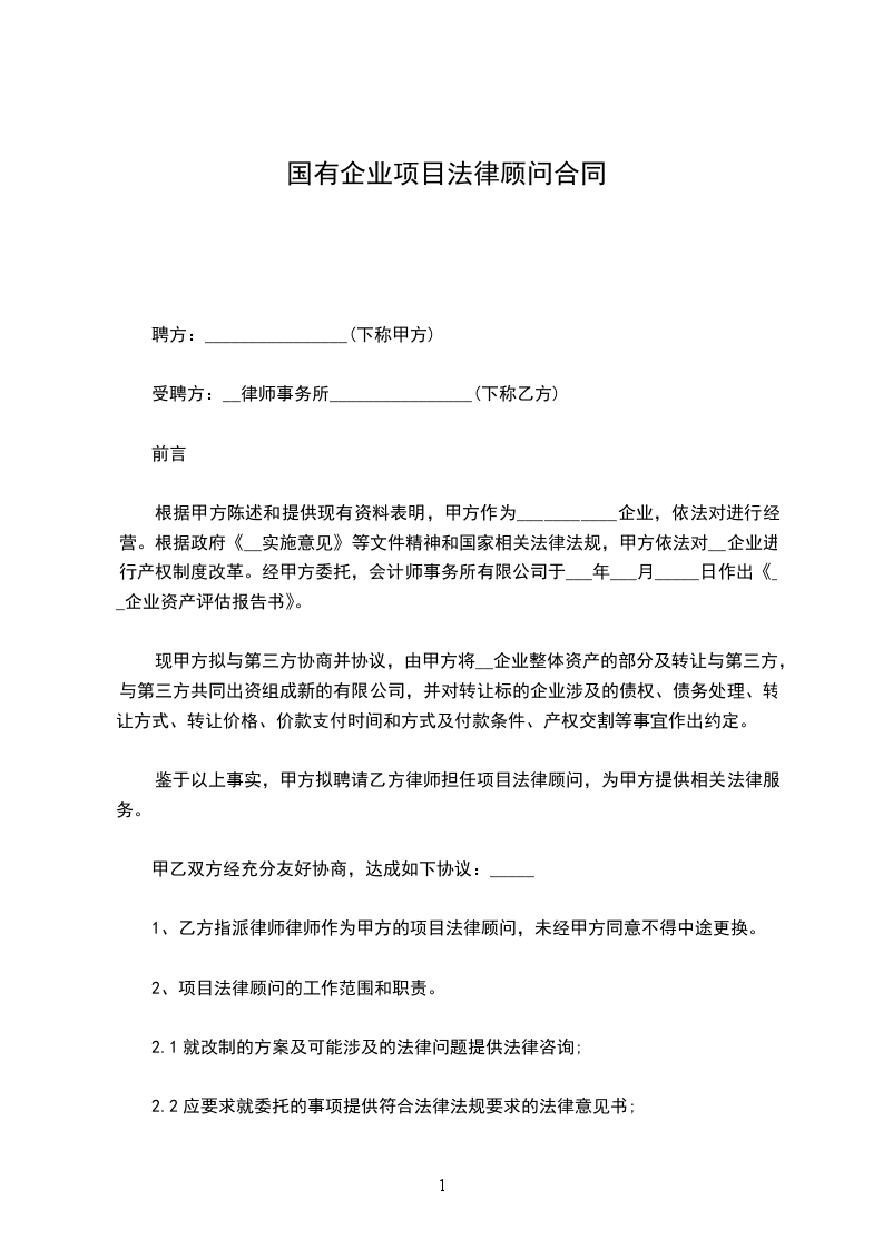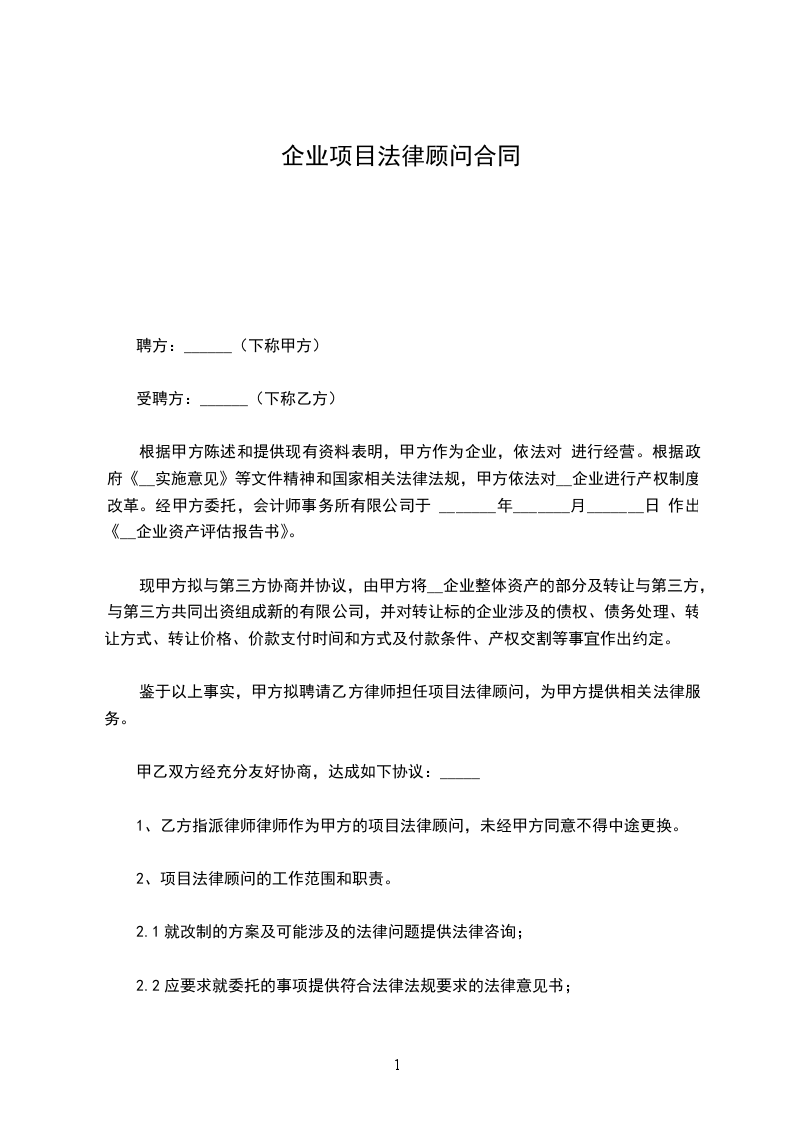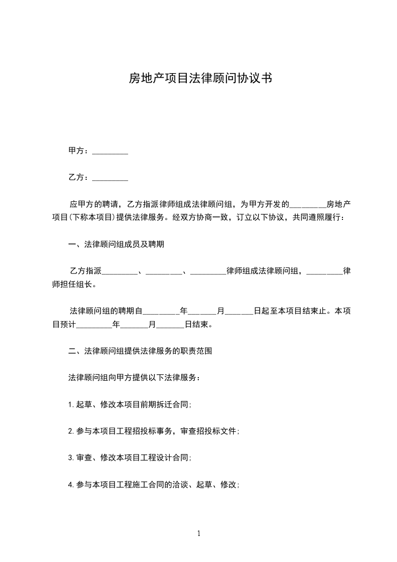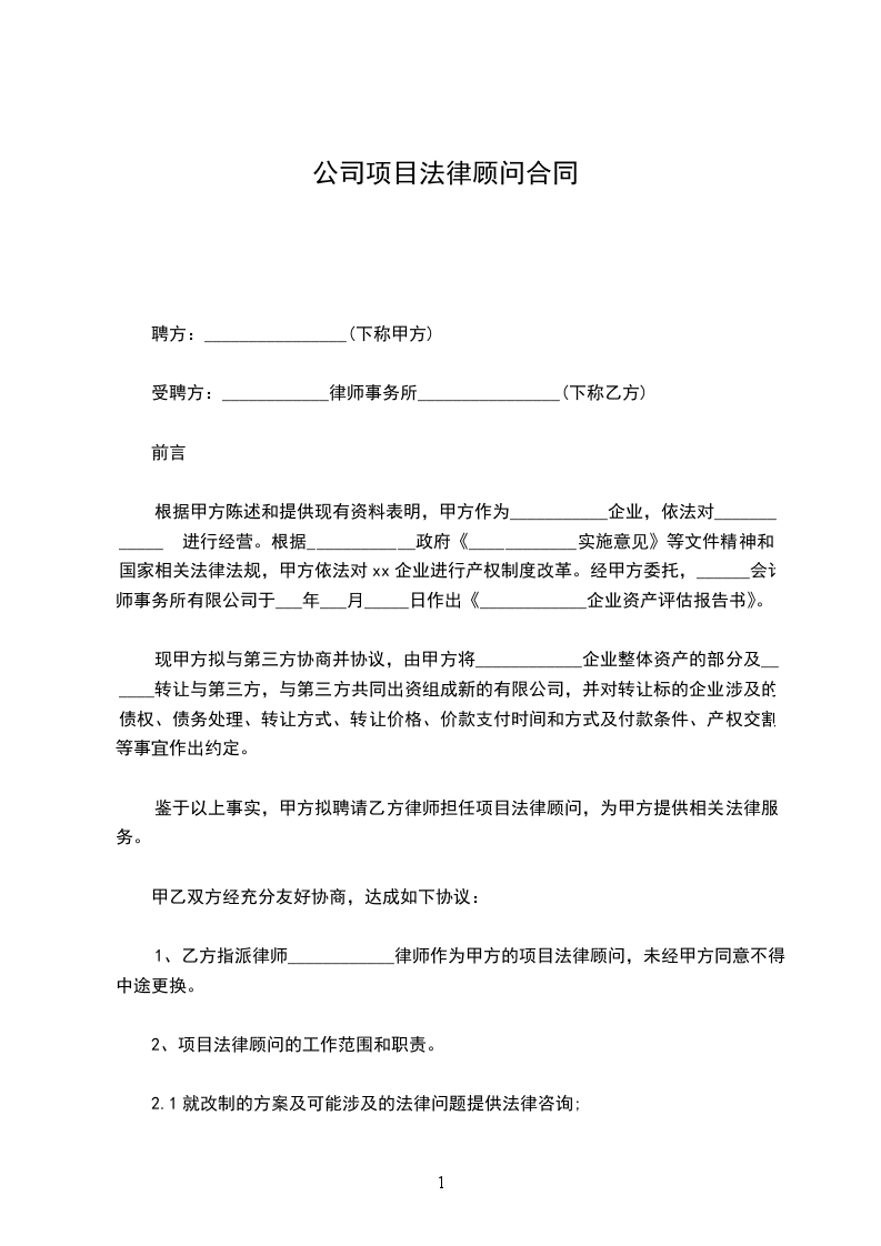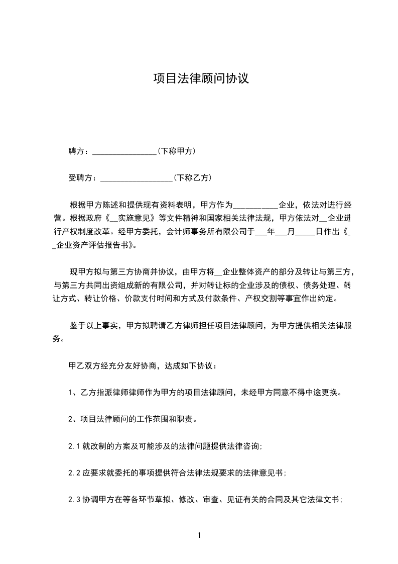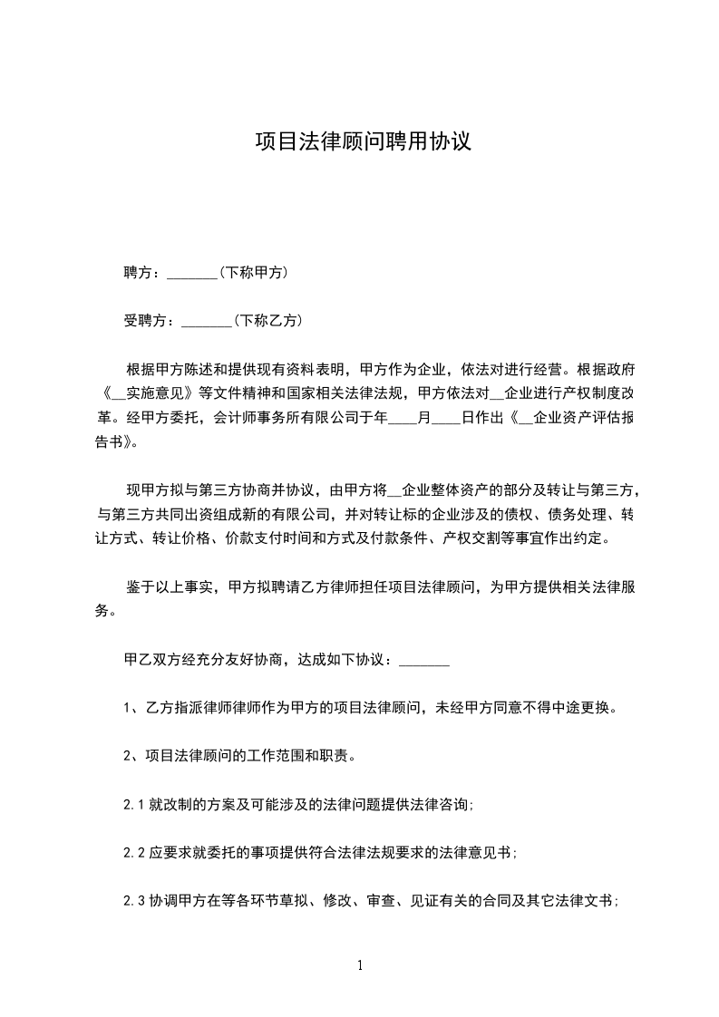 1、乙方指派律师____________律师作为甲方的项目法律顾问,未经甲方同意不得中途更换。