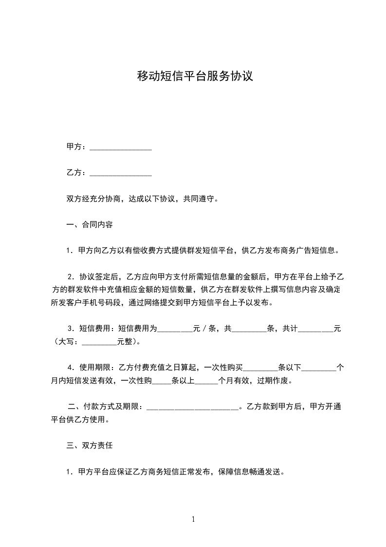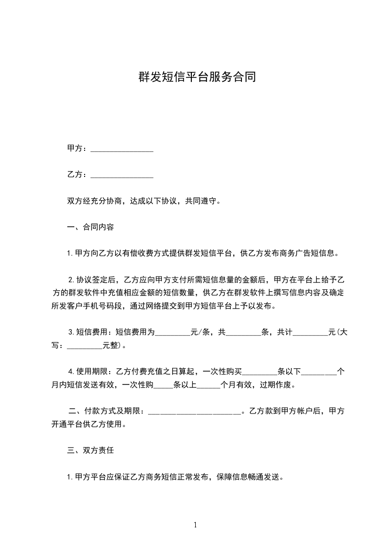 1.甲方向乙方以有偿收费方式提供群发短信平台,供乙方发布商务广告短信息。