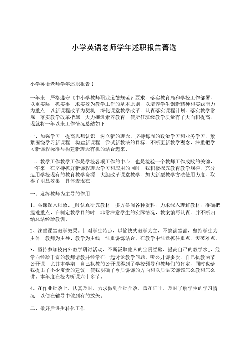 小学英语老师学年述职报告2本学期我担任初二(1)班的英语教学。由于刚刚调进__初中,对新环境、新教材的教学要求知之甚少,加上多年未教初二,教学上遇到前所未有的挑战。因此,本人虚心请教同行、潜心研究教法、在实践中摸索前进。经过一个学期的努力,学到了很多教学经验,也取得了应有的成绩。以下是对本学期教学情况的简要总结。