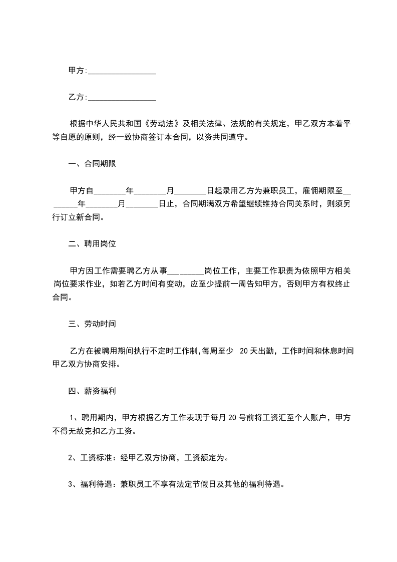 甲方自________年________月________日起录用乙方为兼职员工,雇佣期限至________年________月________日止,合同期满双方希望继续维持合同关系时,则须另行订立新合同。