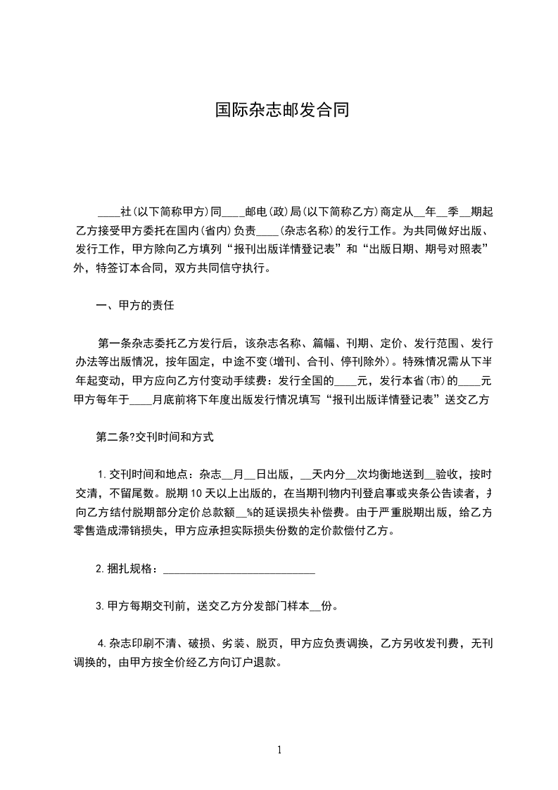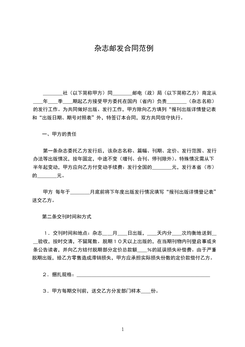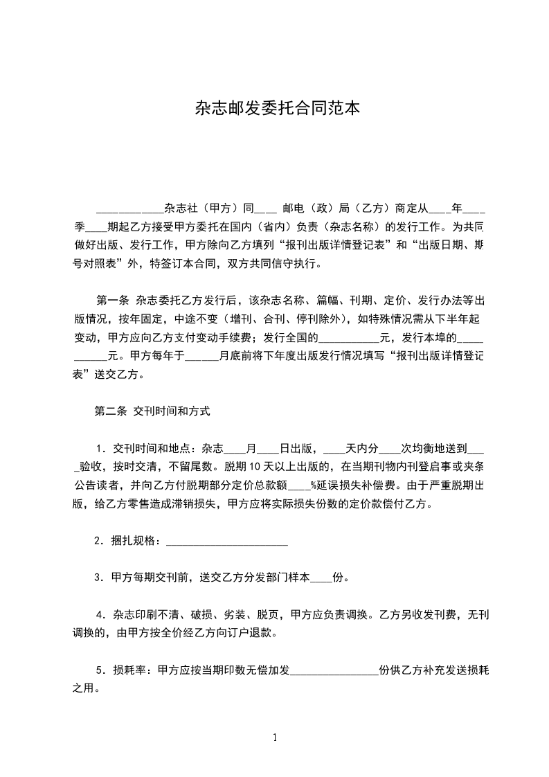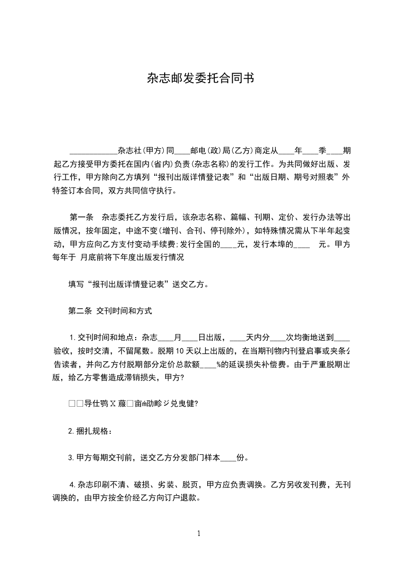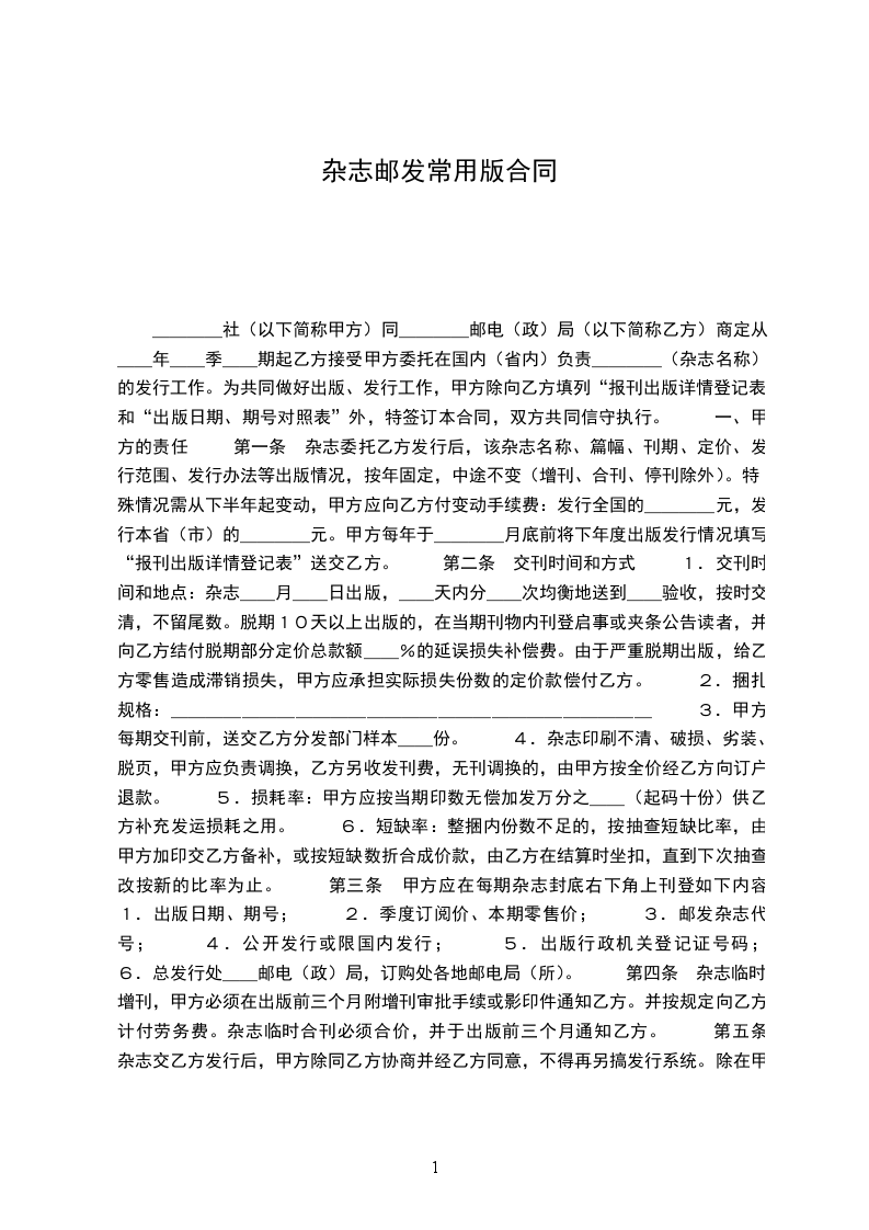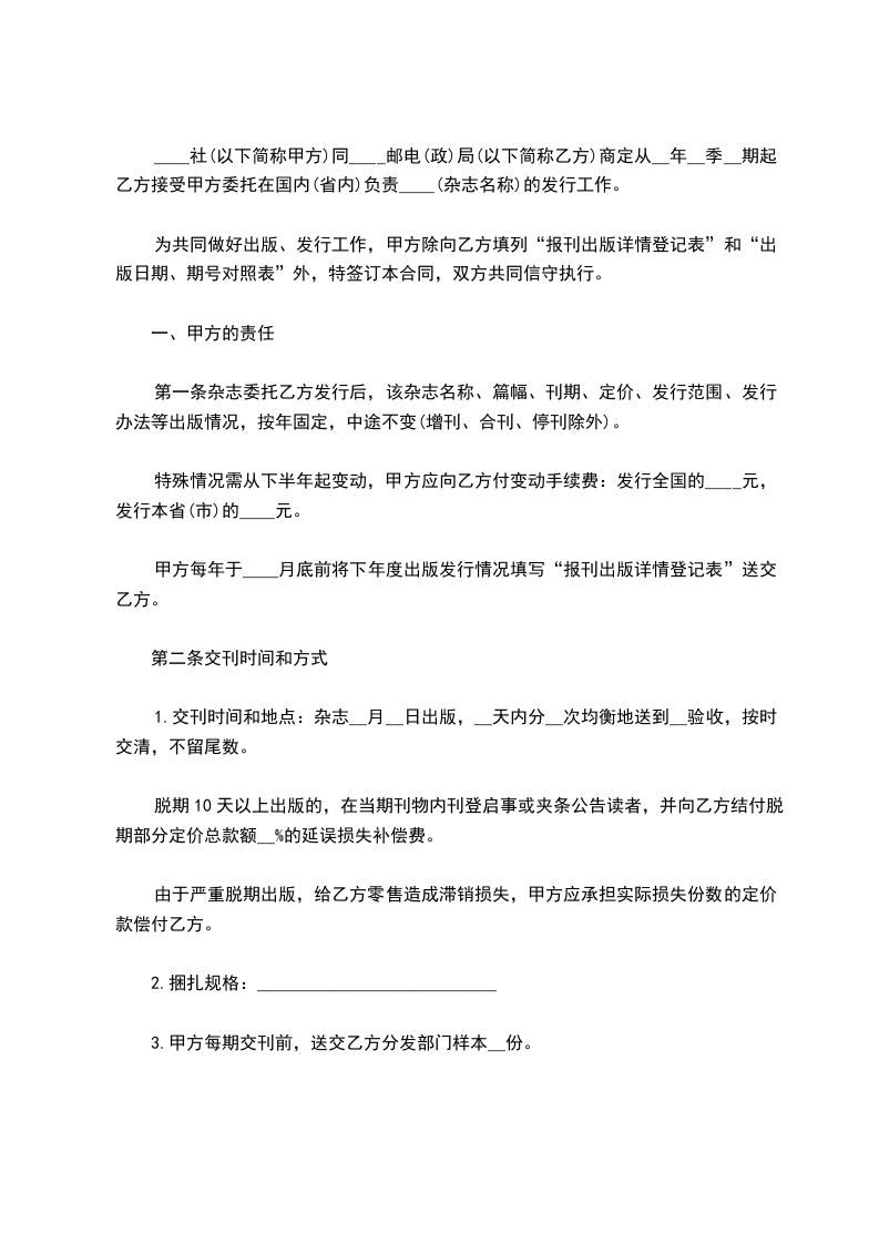____社(以下简称甲方)同____邮电(政)局(以下简称乙方)商定从__年__季__期起乙方接受甲方委托在国内(省内)负责____(杂志名称)的发行工作。为共同做好出版、发行工作,甲方除向乙方填列“报刊出版详情登记表”和“出版日期、期号对照表”外,特签订本合同,双方共同信守执行。