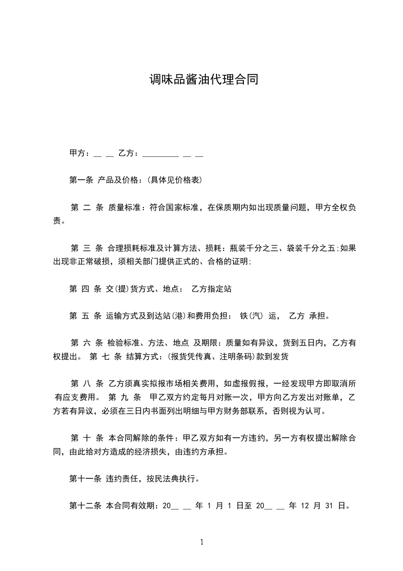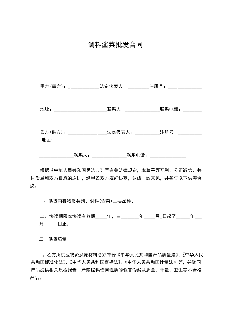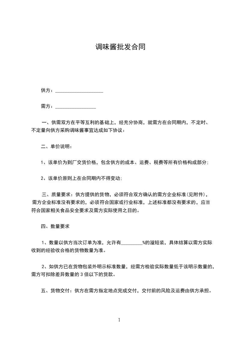 一、供需双方在平等互利的基础上,经充分协商,就需方在合同期内,不定时、不定量向供方采购调味酱事宜达成如下协议: