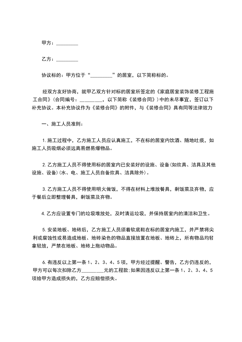 经双方友好协商,就甲乙双方针对标的居室所签定的《家庭居室装饰装修工程施工合同》(合同编号:_________,以下简称《装修合同》)中的未尽事宜,签订以下补充协议。本补充协议作为《装修合同》的附件,与《装修合同》具有同等法律效力。
