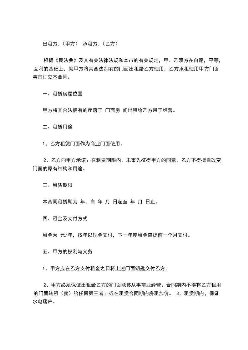 根据《民法典》及其有关法律法规和本市的有关规定,甲、乙双方在自愿,平等,互利的基础上,就甲方将其合法拥有的门面出租给乙方使用,乙方承租使用甲方门面事宜订立本合同。