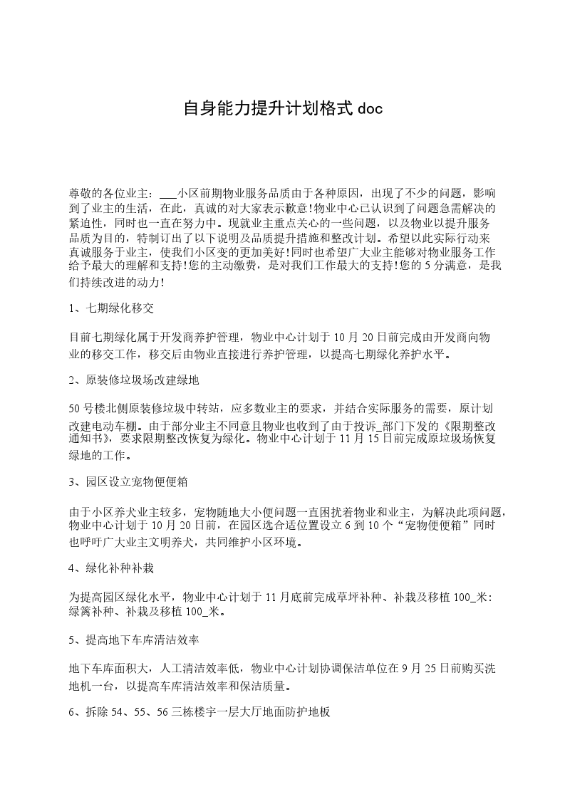 尊敬的各位业主:___小区前期物业服务品质由于各种原因,出现了不少的问题,影响到了业主的生活,在此,真诚的对大家表示歉意!物业中心已认识到了问题急需解决的紧迫性,同时也一直在努力中。现就业主重点关心的一些问题,以及物业以提升服务品质为目的,特制订出了以下说明及品质提升措施和整改计划。希望以此实际行动来真诚服务于业主,使我们小区变的更加美好!同时也希望广大业主能够对物业服务工作给予最大的理解和支持!您的主动缴费,是对我们工作最大的支持!您的5分满意,是我们持续改进的动力!