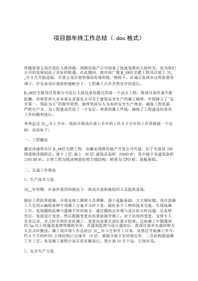 我司承建龙湖·江体项目三期工程,于20__年2月5日开工,施工至20__年4月6日。已按本工程施工合同约定内容、施工图说、设计变更、图纸会审纪要及重庆市现行施工规范施工完毕,在整个施工过程中无质量、安全事故,自评合格。现将施工情况总结如下: