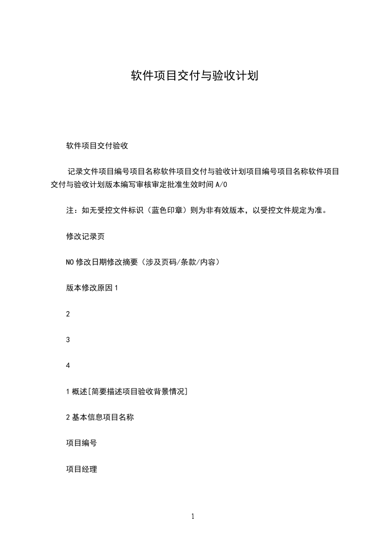 记录文件项目编号项目名称软件项目交付与验收计划项目编号项目名称软件项目交付与验收计划版本编写审核审定批准生效时间A/0