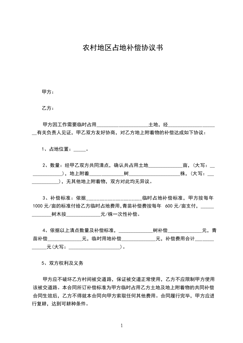 3、补偿标准:依据_____________________临时占地补偿标准,甲方按每年1000元/亩的标准付给乙方临时占地费用,青苗补偿费按每年600元/亩支付,______________树木按______________元/株一次性补偿。