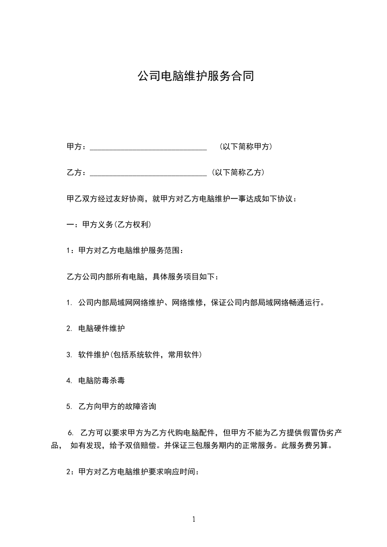 1:甲方对乙方电脑维护服务范围: