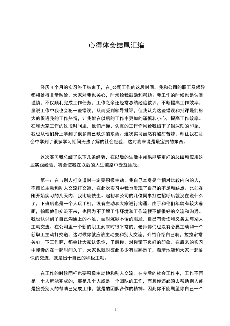 经历4个月的实习终于结束了,在_公司工作的这段时间,我和公司的职工及领导都相处得非常融洽,大家对我也关心,时常给我鼓励和帮助;我工作的时候也是认真谨慎,不仅顺利完成工作任务,工作之余还经常总结经验教训,不断提高工作效率,虽说工作中我也会犯一些错误,从而受到领导批评,但我认为这些错误和批评是能极大的促进我的工作热情,让我能在以后的工作中更加的谨慎和小心,提高工作效率。在和大家工作的这段时间里,他们严谨、认真的工作作风给我留下了很深刻的印象,我也从他们身上学到了很多自己缺少的东西。这次实习虽然有酸甜苦辣,却让我在社会中学到了很多学习期间无法了解的社会经验,这对我来说是最宝贵的东西。