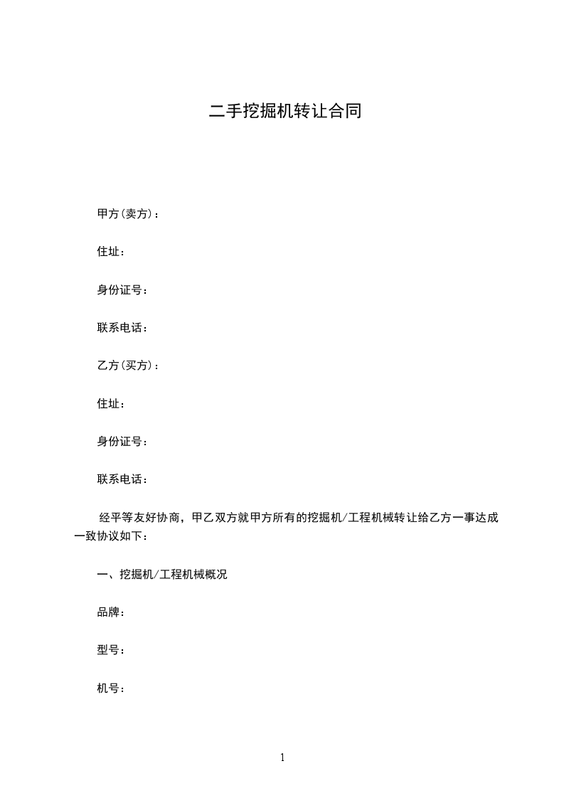 经平等友好协商,甲乙双方就甲方所有的挖掘机/工程机械转让给乙方一事达成一致协议如下: