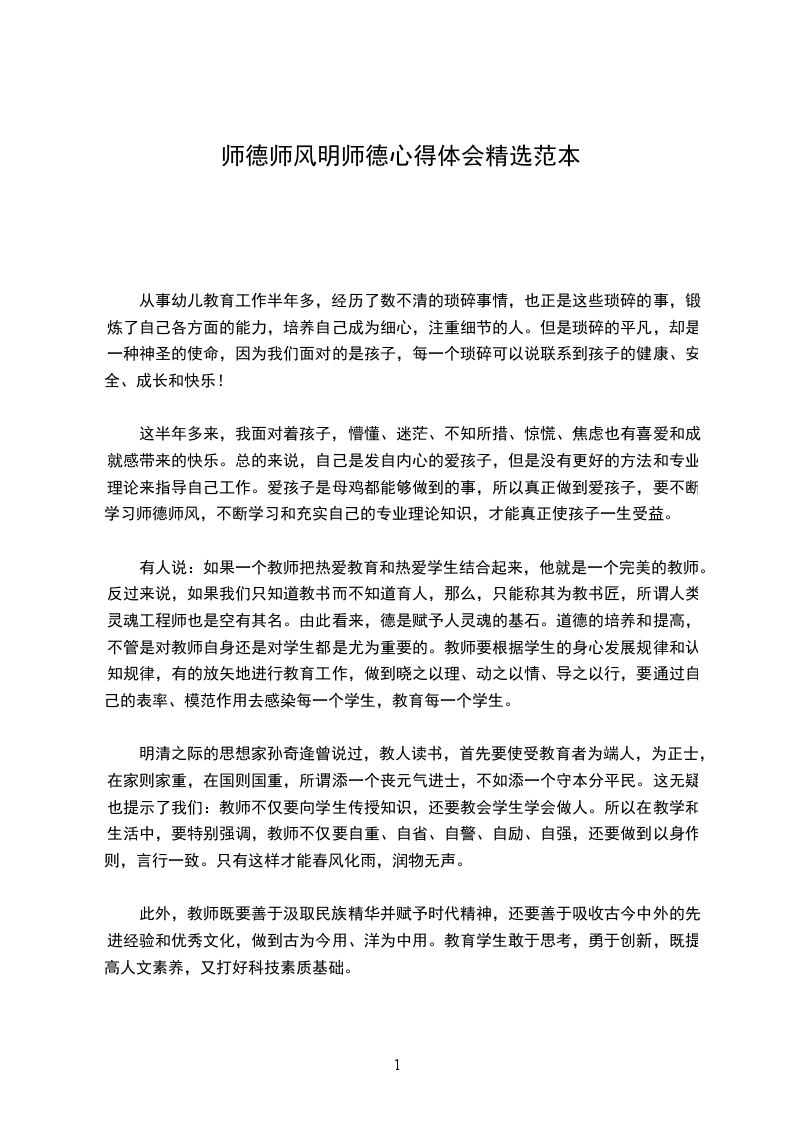 作为一名教师,在开展师德的学习活动中,我深深感到,要做一个深受学生欢迎的教师,第一要义就是要有高尚的师德。教师不仅是精神文明的建设者和传播者,更是学生学习的榜样。师德,是成为一个合格教师的道德底线,一个缺乏道德底线的教师是无论如何也担当不了"人类灵魂的工程师"的。良好的师德,就是要求教师必须保持对教师这个职业的一种敬畏心理。"学高为师,身正为范"永远是教师职业的不变准则。