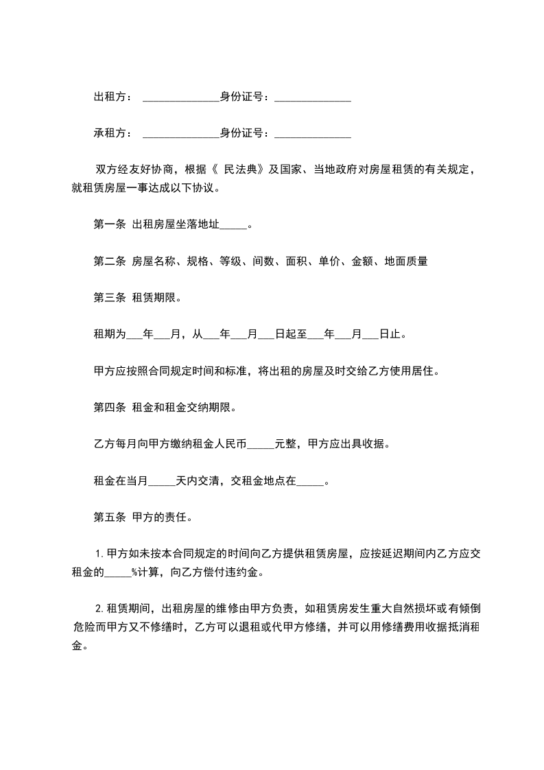 5、房屋及其设备由于不可抗力造成的损失,甲、乙双方互不承担责任。