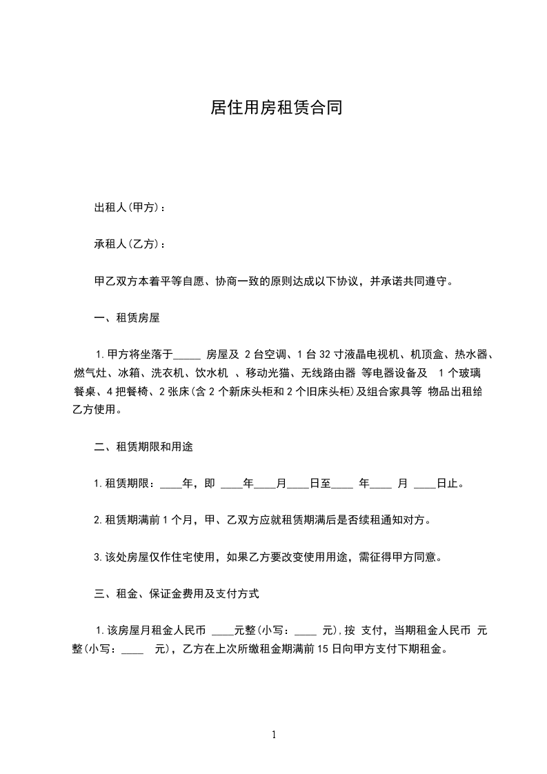 1.甲方将坐落于_____ 房屋及 2台空调、1台32寸液晶电视机、机顶盒、热水器、燃气灶、冰箱、洗衣机、饮水机 、移动光猫、无线路由器 等电器设备及 1个玻璃餐桌、4把餐椅、2张床(含2个新床头柜和2个旧床头柜)及组合家具等 物品出租给乙方使用。