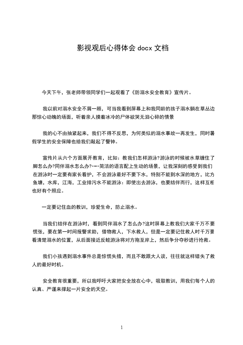 我以前对溺水安全不屑一顾,可当我看到屏幕上和我同龄的孩子溺水躺在草丛边那惊心动魄的场面,听着亲人摸着冰冷的尸体欲哭无泪心碎的情景