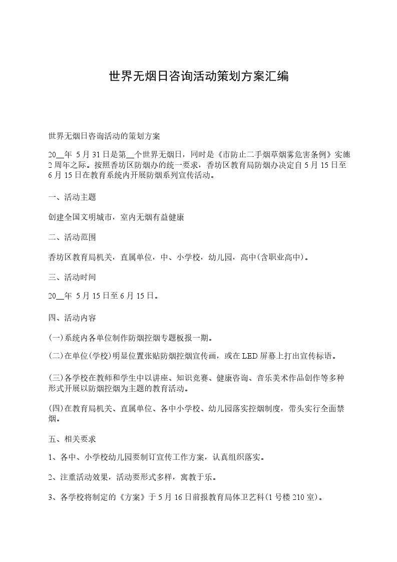 20__年 5月31日是第__个世界无烟日,同时是《市防止二手烟草烟雾危害条例》实施2周年之际。按照香坊区防烟办的统一要求,香坊区教育局防烟办决定自5月15日至6月15日在教育系统内开展防烟系列宣传活动。