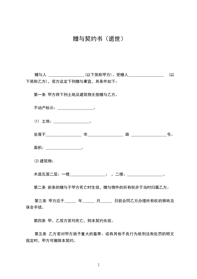 第一条 甲方将下列土地及建筑物无偿赠与乙方。
