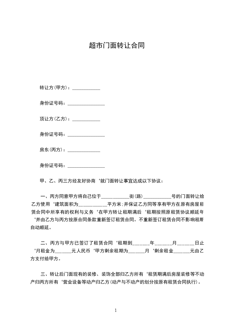 一、丙方同意甲方将自己位于____________街(路)____________号的门面转让给乙方使用‘建筑面积为____________平方米;并保证乙方同等享有甲方在原有房屋租赁合同中所享有的权利与义务‘在甲方转让租期满后‘租期按照原租赁协议顺延年‘并由乙方与丙方按原合同条款重新签订租赁合同。不重新签订租赁合同不影响租期自动顺延。