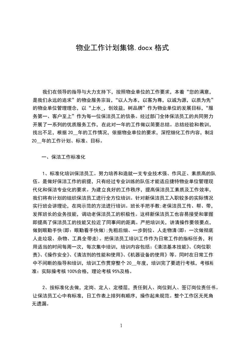 我们在领导的指导与大力支持下,按照物业单位的工作要求,本着“您的满意,是我们永远的追求”的物业服务宗旨,“以人为本,以客为尊,以诚为源,以质为先”的物业单位管理理念,以“上水_,创效益,树品牌”作为物业单位的发展目标,“服务第一、客户至上”作为每一位保洁员工的信条。经过部门全体保洁员工的共同努力,开展了一系列的优质服务工作,在此对一年的工作做以简要总结。总结经验和教训,找出不足,根据20__年的工作情况,依据物业单位的要求,深挖细化工作内容,制定20__年的工作计划、标准、目标。