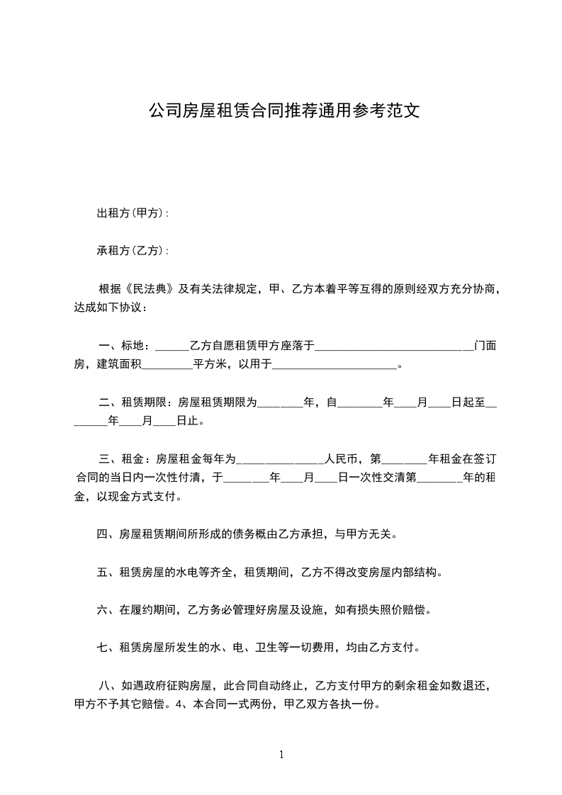 八、如遇政府征购房屋,此合同自动终止,乙方支付甲方的剩余租金如数退还,甲方不予其它赔偿。4、本合同一式两份,甲乙双方各执一份。