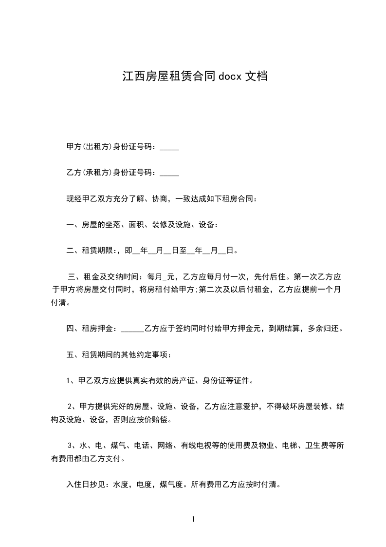 入住日抄见:水度,电度,煤气度。所有费用乙方应按时付清。
