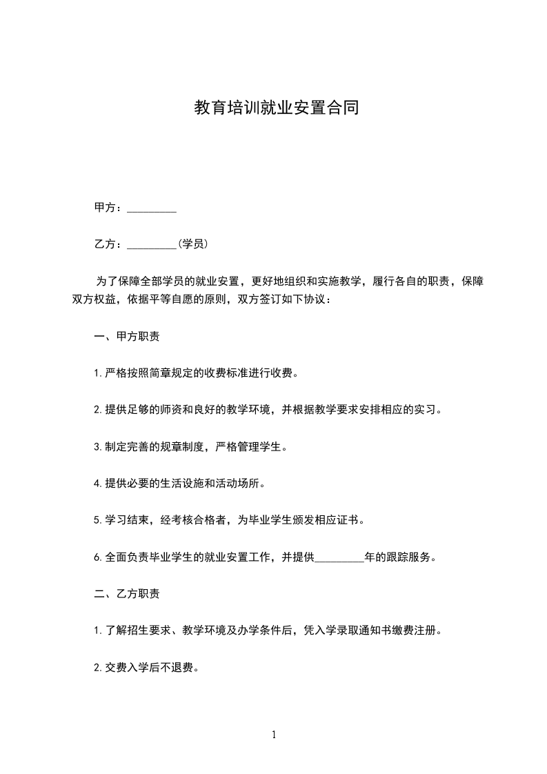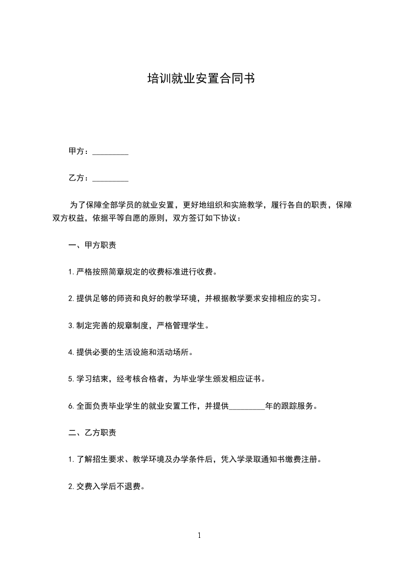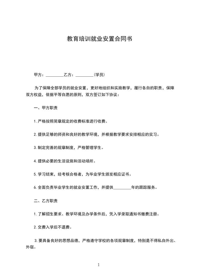 为了保障全部学员的就业安置,更好地组织和实施教学,履行各自的职责,保障双方权益,依据平等自愿的原则,双方签订如下协议: