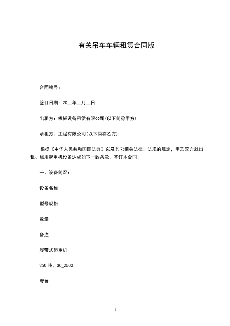根据《中华人民共和国民法典》以及其它相关法律、法规的规定,甲乙双方就出租、租用起重机设备达成如下一致条款,签订本合同: