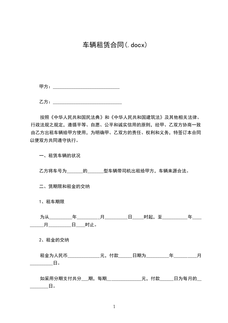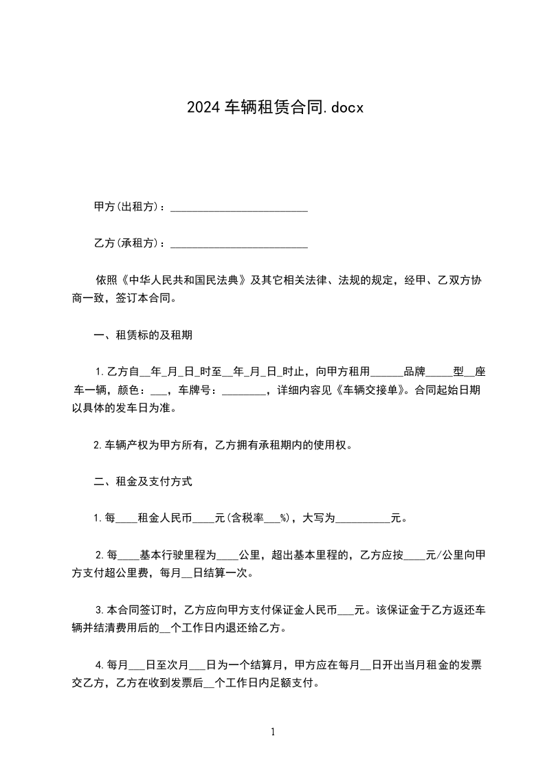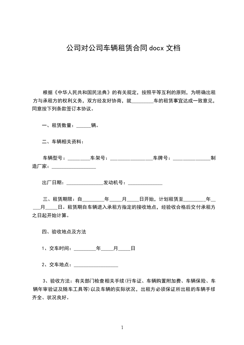 根据《中华人民共和国民法典》的有关规定,按照平等互利的原则,为明确出租方与承租方的权利义务,双方经友好协商,就_________车的租赁事宜达成一致意见,同意按下列条款签订本协议。