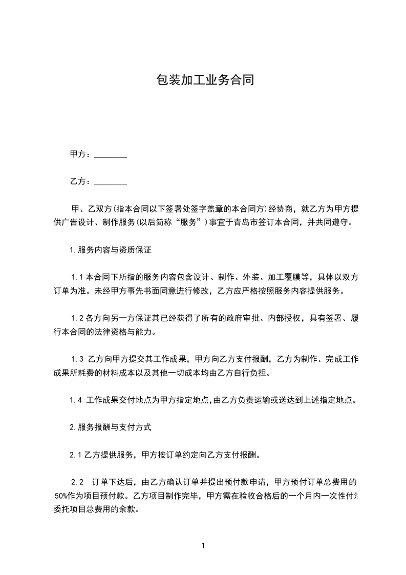 1.1本合同下所指的服务内容包含设计、制作、外装、加工覆膜等,具体以双方订单为准。未经甲方事先书面同意进行修改,乙方应严格按照服务内容提供服务。