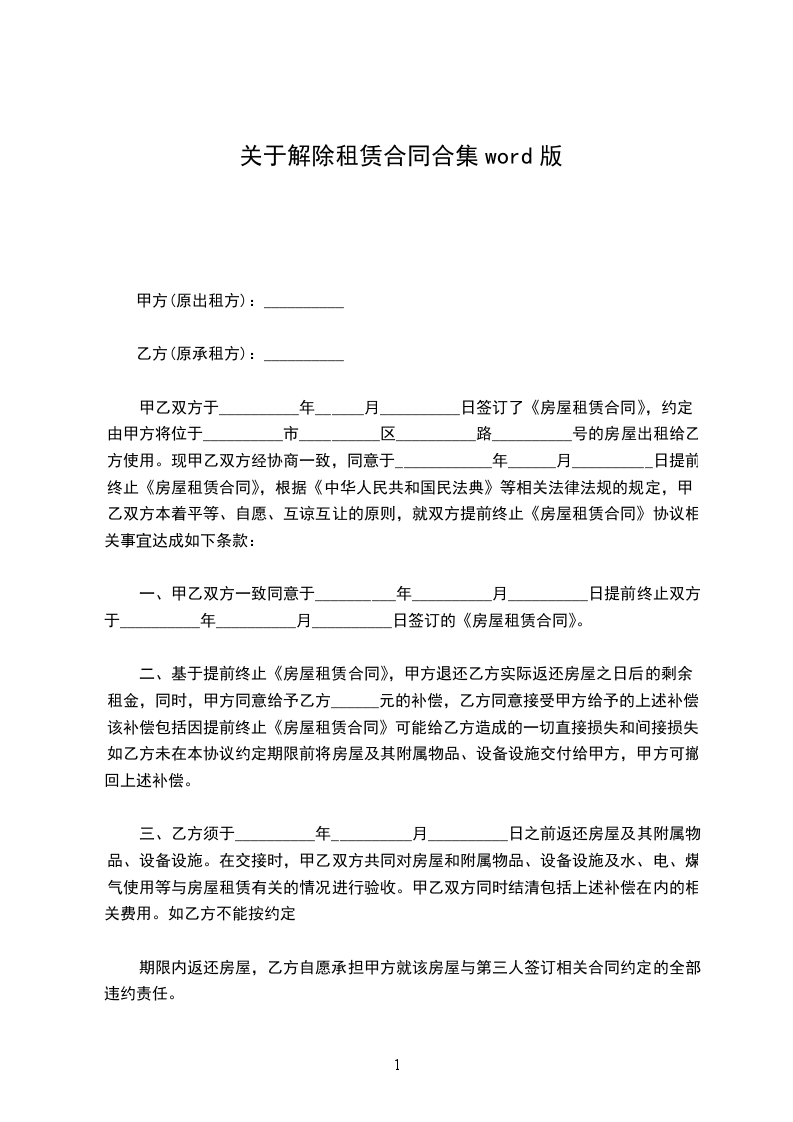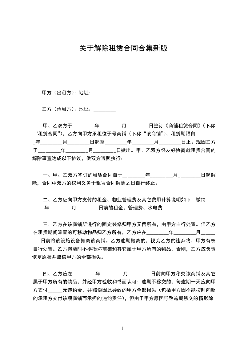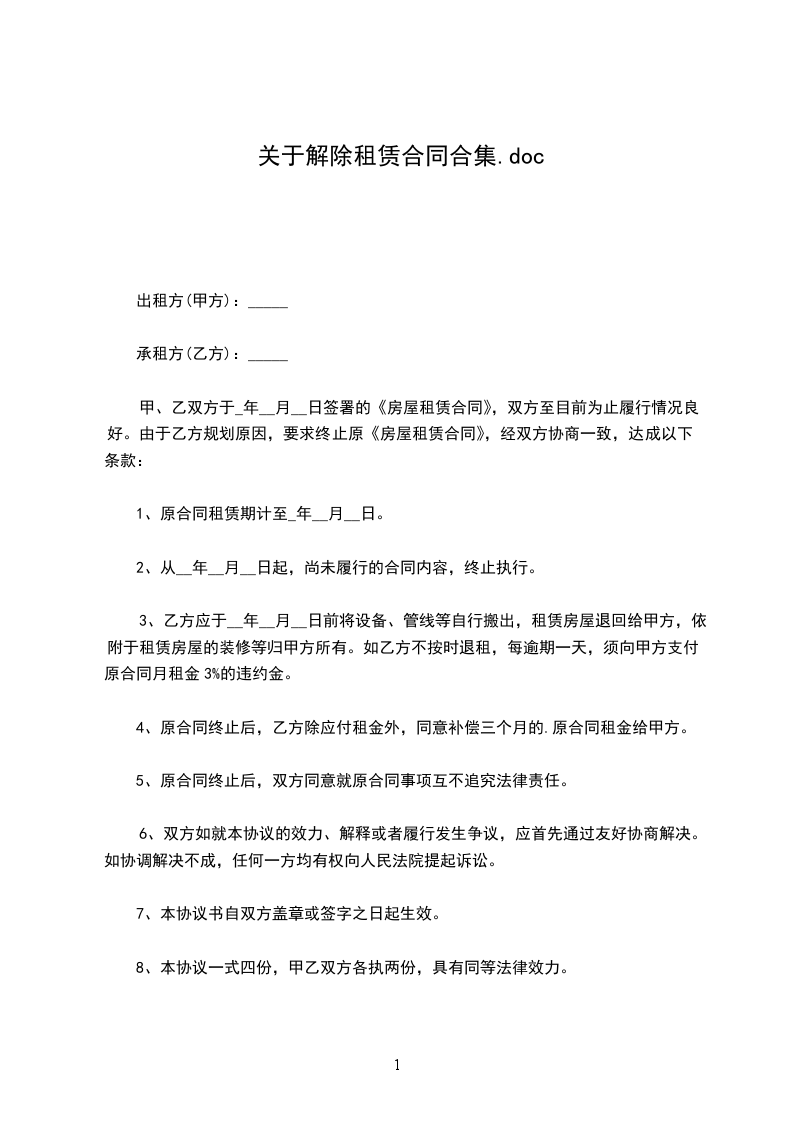 一、甲、乙双方签订的租赁合同自于_________年_________月_________日起解除,合同中双方的权利义务于租赁合同解除之日自行终止。
