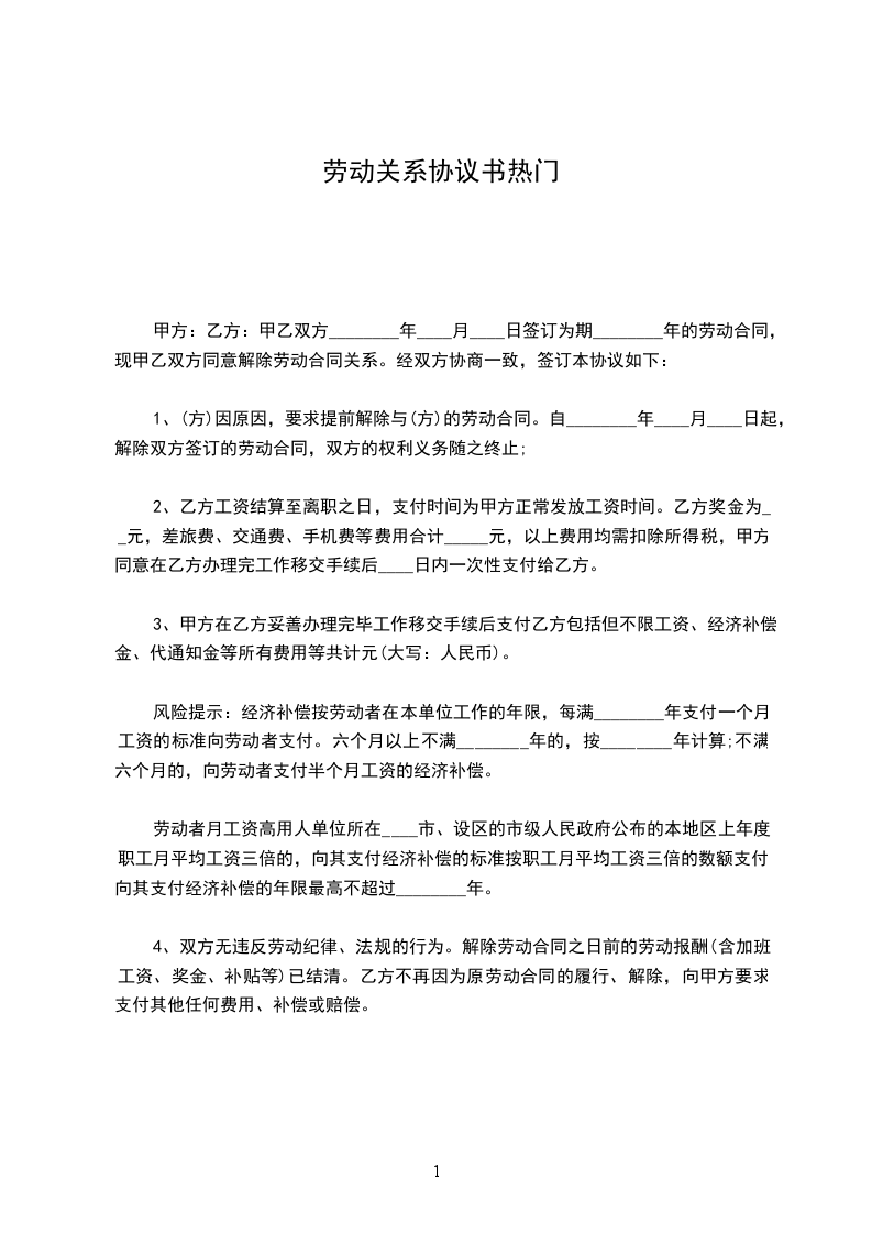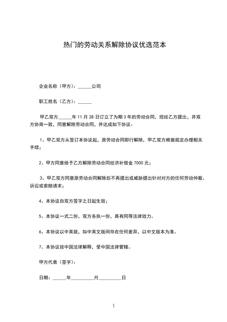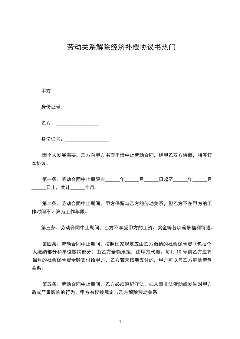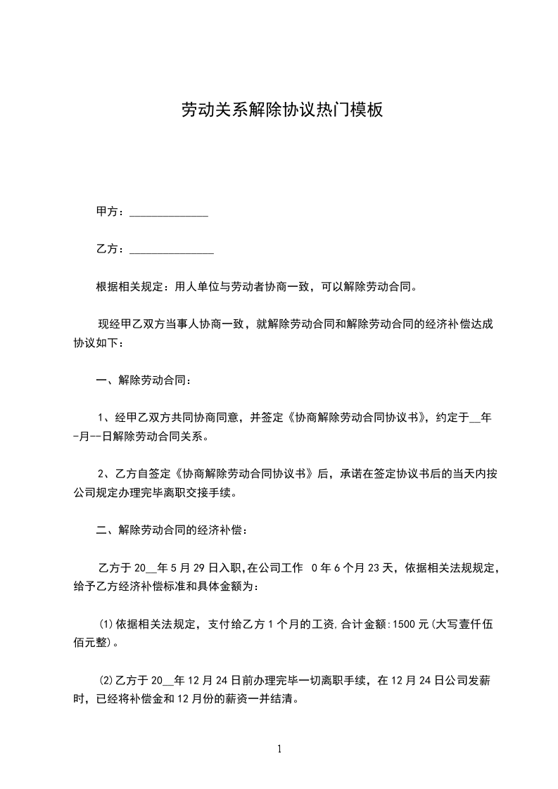 1、经甲乙双方共同协商同意,并签定《协商解除劳动合同协议书》,约定于__年-月--日解除劳动合同关系。