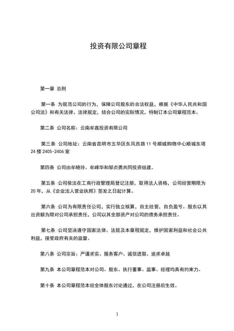 第二条 公司名称:云南牟鑫投资有限公司