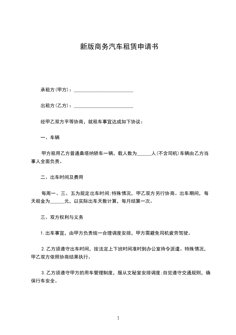 甲方租用乙方普通桑塔纳轿车一辆,载人数为______人(不含司机)车辆由乙方当事人全面负责。