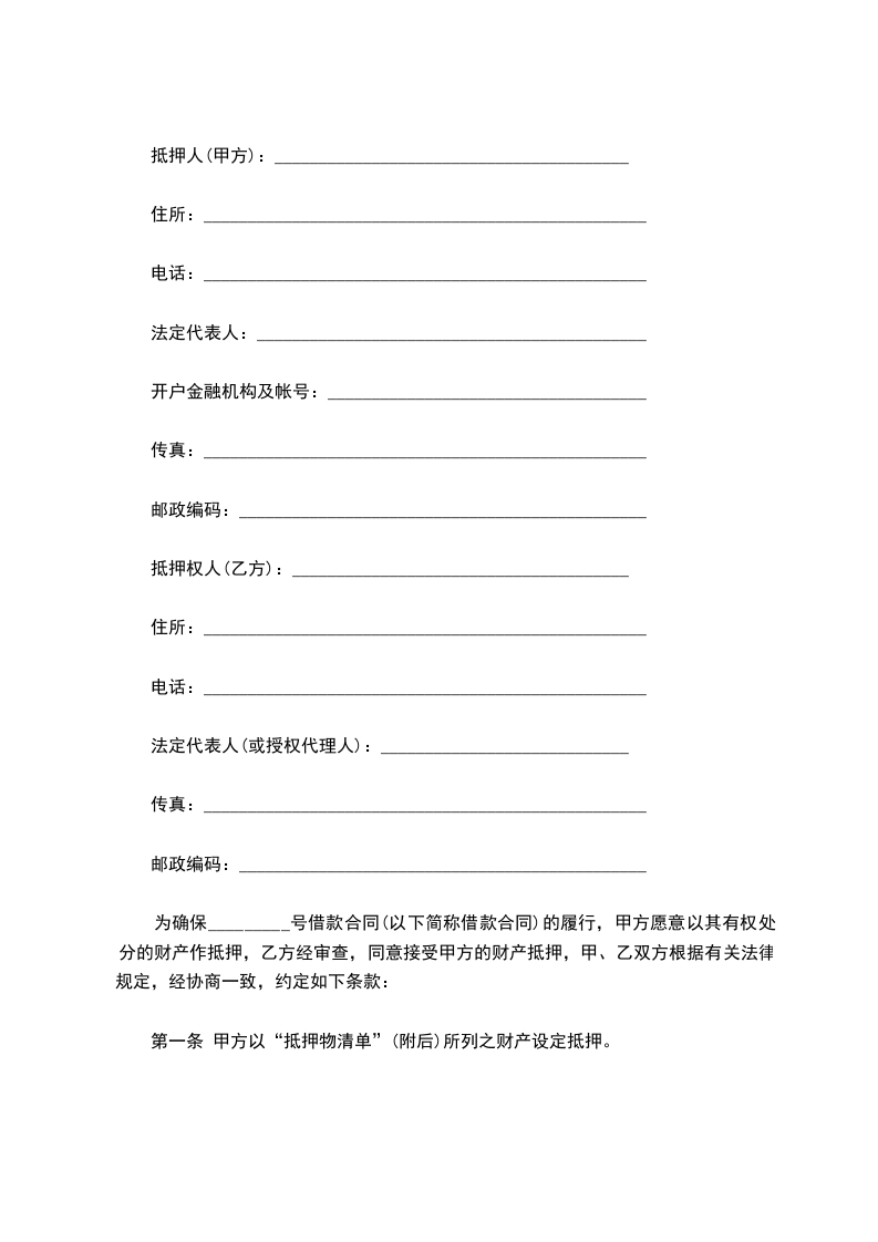 第一条 甲方以“抵押物清单”(附后)所列之财产设定抵押。