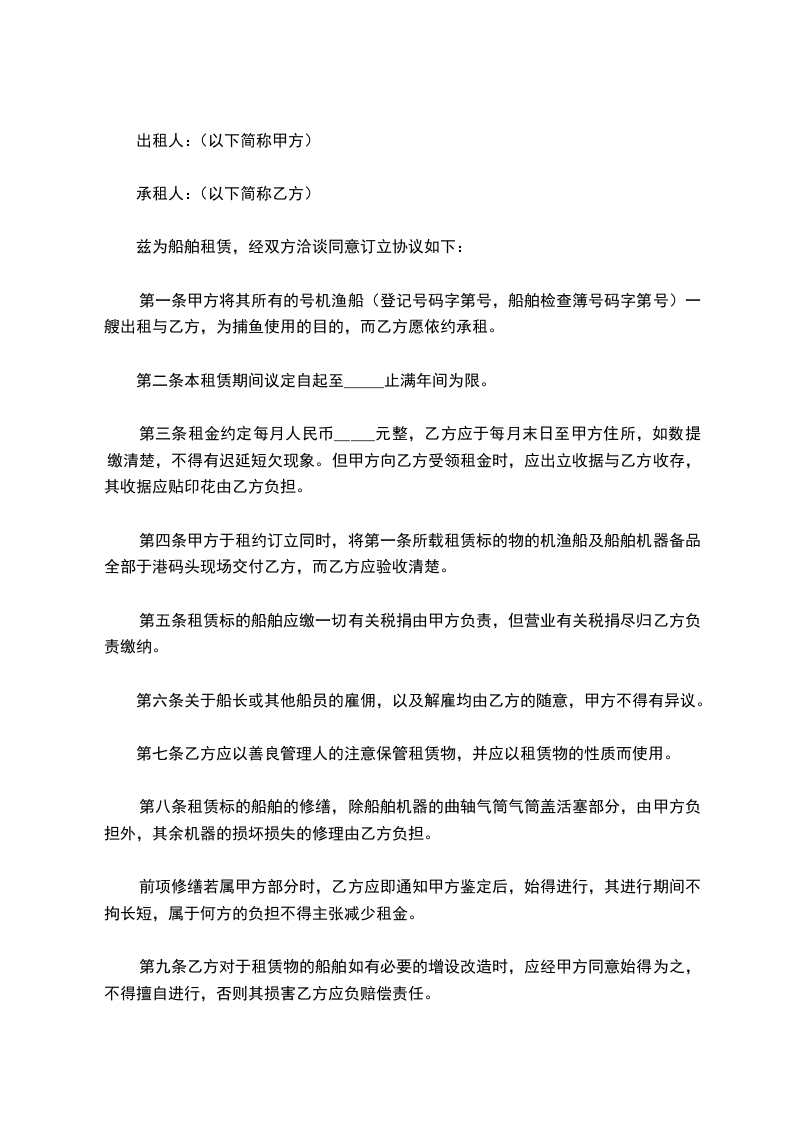 第一条甲方将其所有的号机渔船(登记号码字第号,船舶检查簿号码字第号)一艘出租与乙方,为捕鱼使用的目的,而乙方愿依约承租。