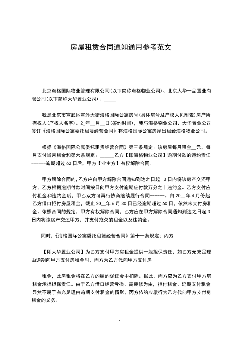 (三)租赁期内,甲方需提前收回该房屋的,应提前______日通知乙方,将已收取的租金余额退还乙方并按月租金的______%支付违约金。