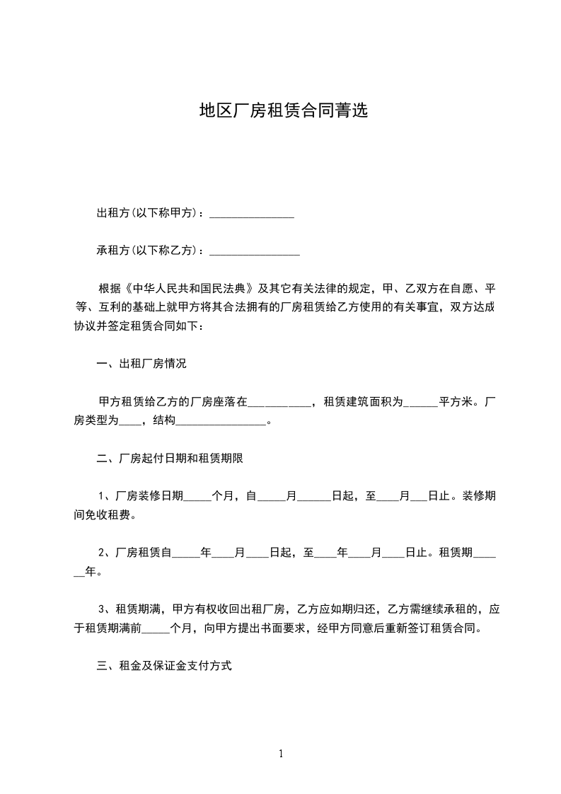 3、甲、乙双方一旦签订合同,乙方应向甲方支付厂房租赁保证金,保证金为一个月租金。租金应预付三个月,支付日期在支付月___日前向甲方支付租金。