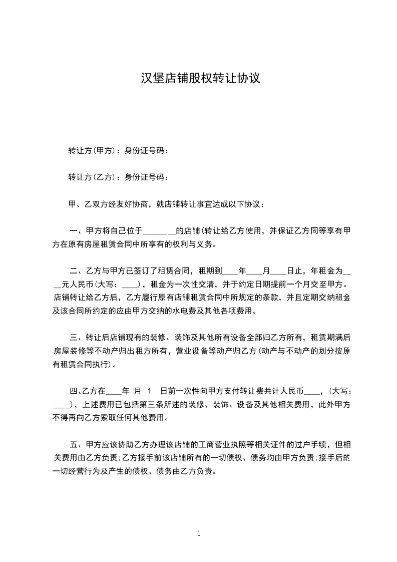 一、甲方将自己位于________的店铺(转让给乙方使用,并保证乙方同等享有甲方在原有房屋租赁合同中所享有的权利与义务。