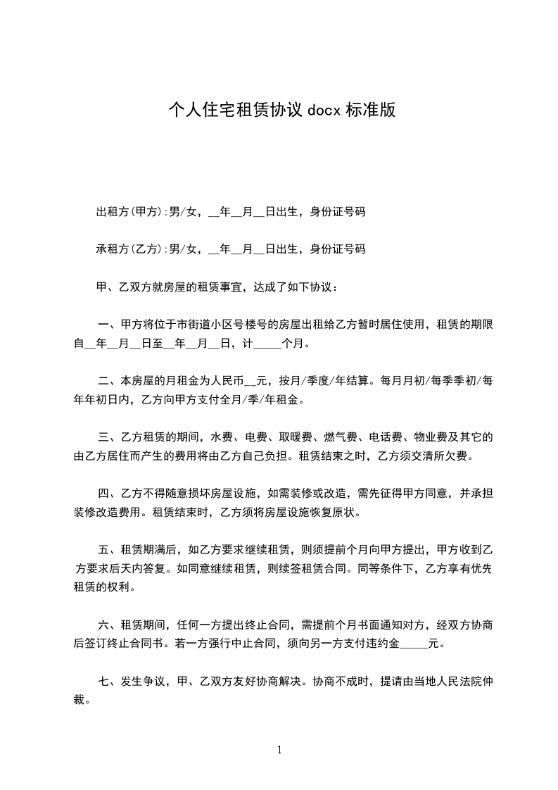 承租方(乙方):男/女,__年__月__日出生,身份证号码