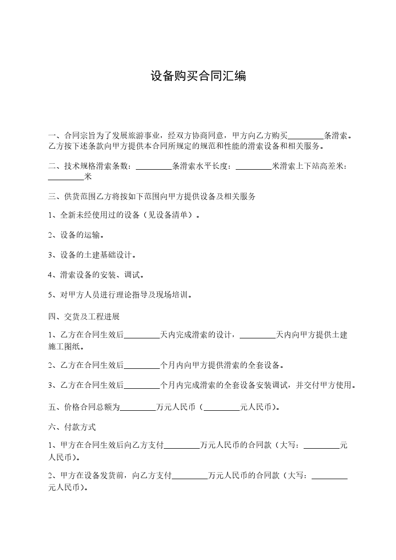 一、合同宗旨为了发展旅游事业,经双方协商同意,甲方向乙方购买_________条滑索。乙方按下述条款向甲方提供本合同所规定的规范和性能的滑索设备和相关服务。