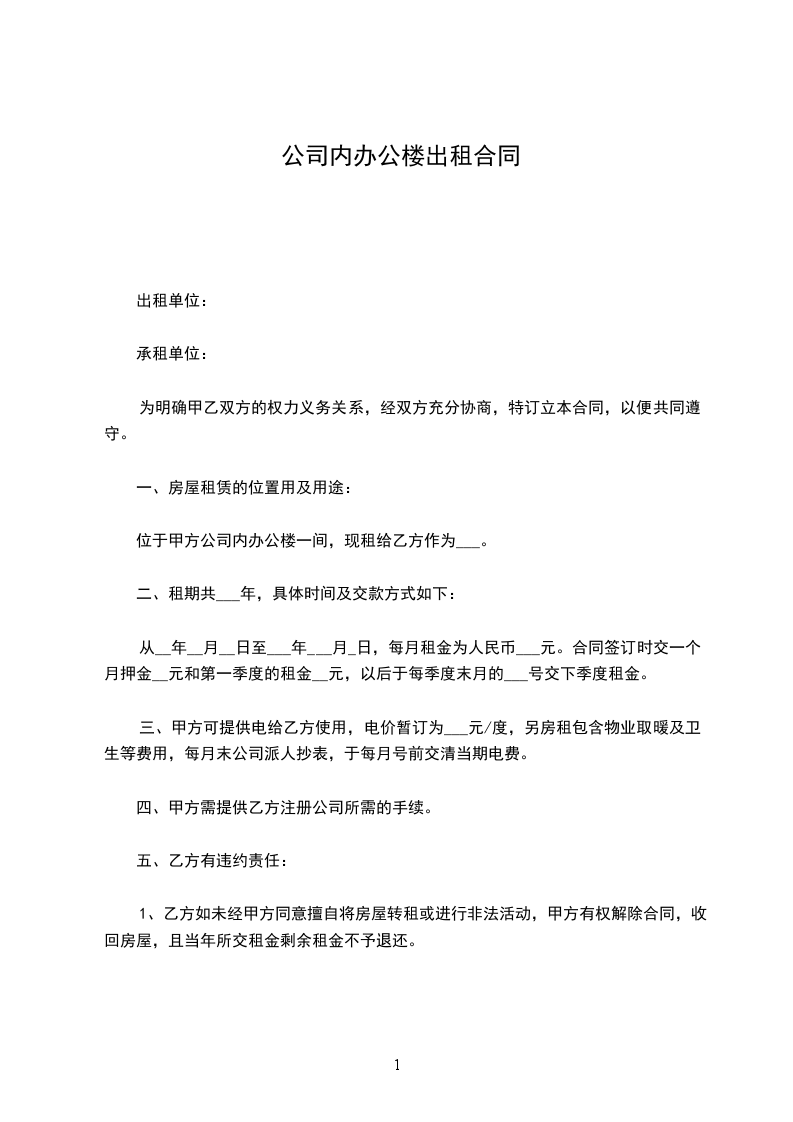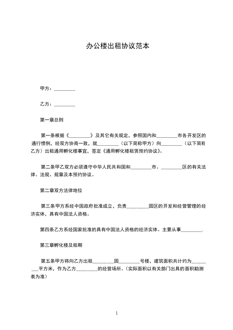 第一条根据《_________》及其它有关规定,参照国内和_________市各开发区的通行惯例,经双方协商一致,就_________(以下简称甲方)向_________(以下简称乙方)出租通用孵化楼事宜,签定《通用孵化楼租赁预约协议》。