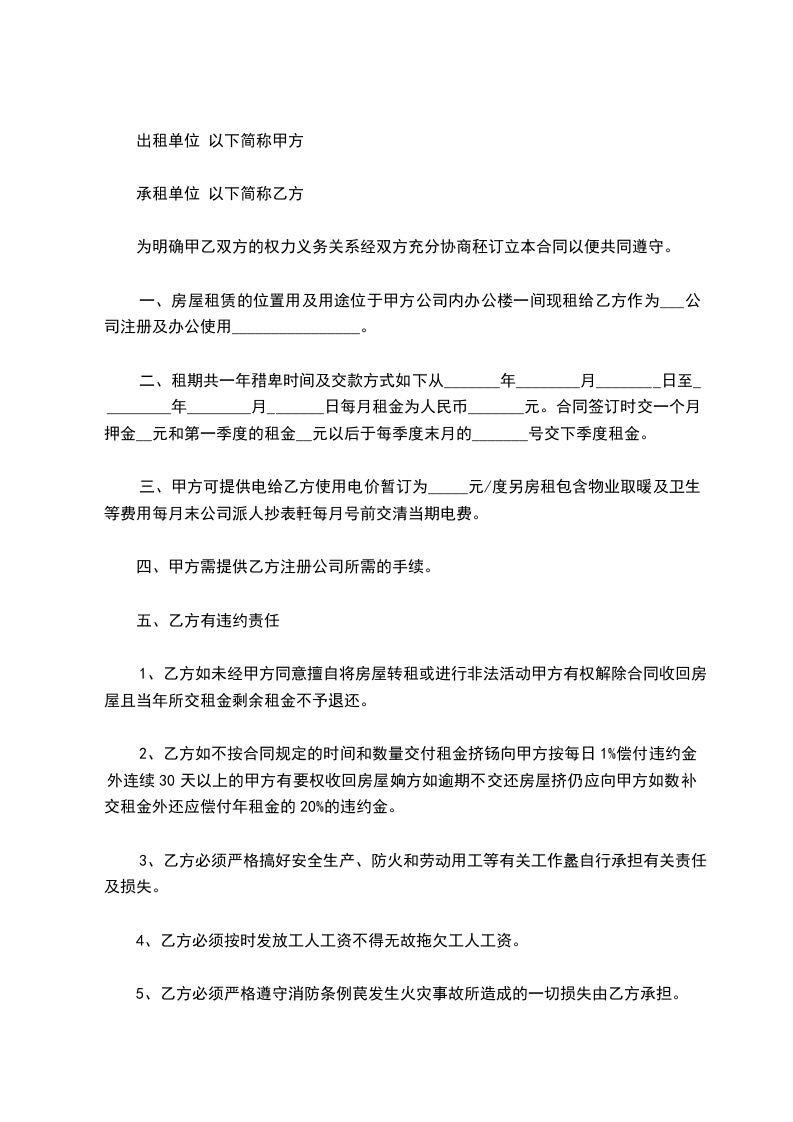 第六条乙方向甲方租赁本预约协议第五条所定通用孵化楼,租期_________年,自双方签订通用孵化楼的租赁合同之日起算。