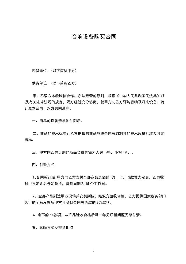 1、合同签订后,甲方向乙方支付全部商品总额的.约_40__%款做为定金,乙方收到甲方定金后开始备货,备货周期为15个工作日。