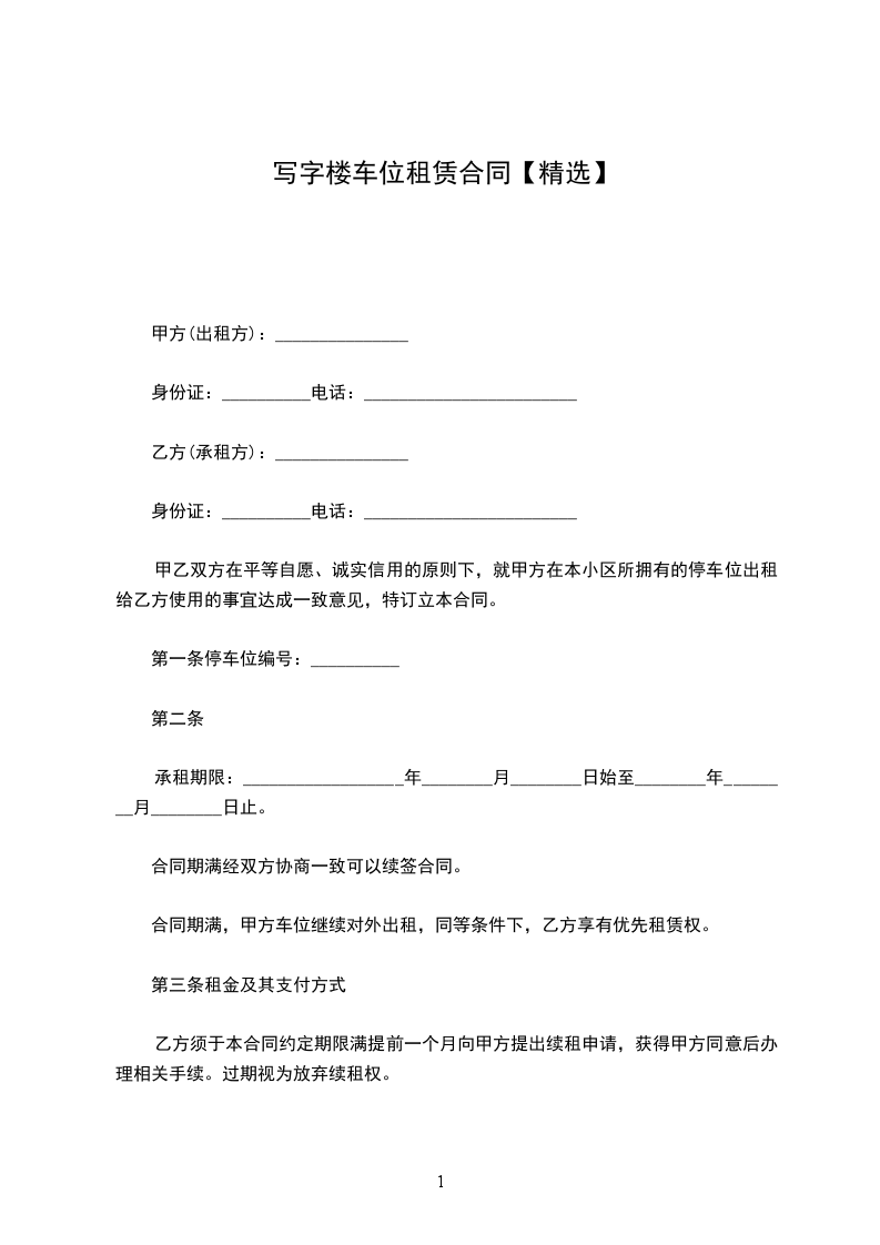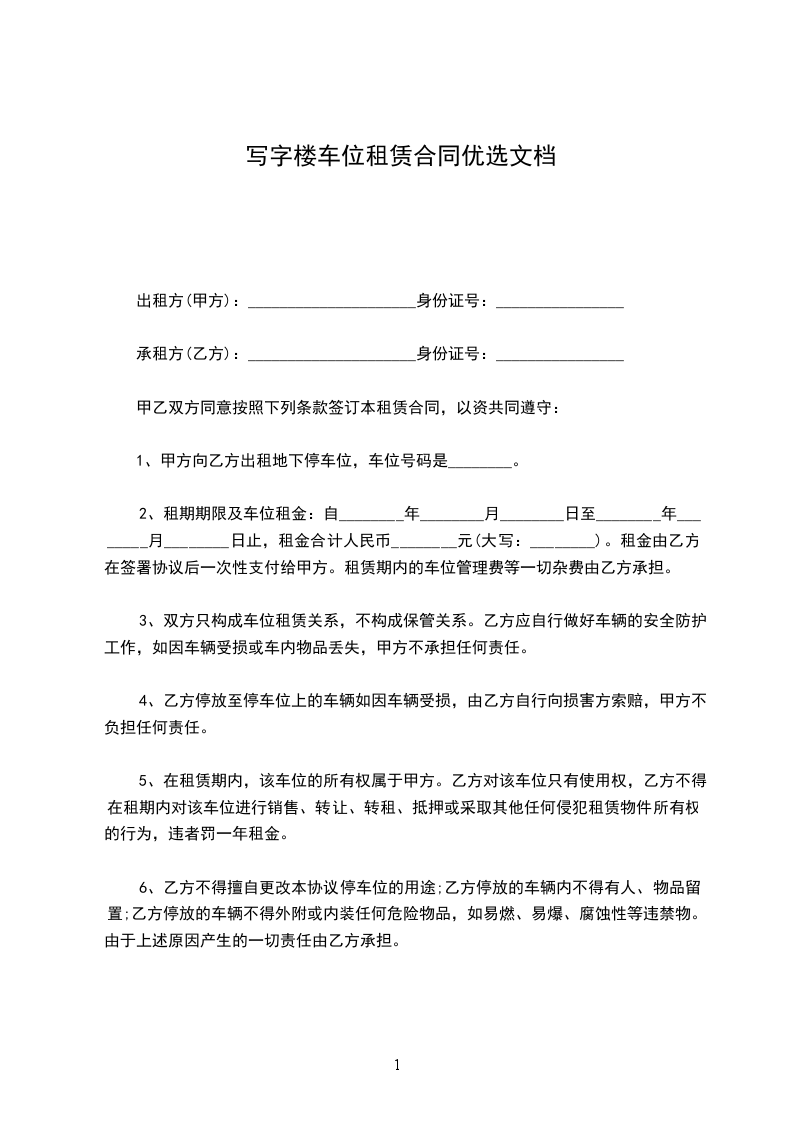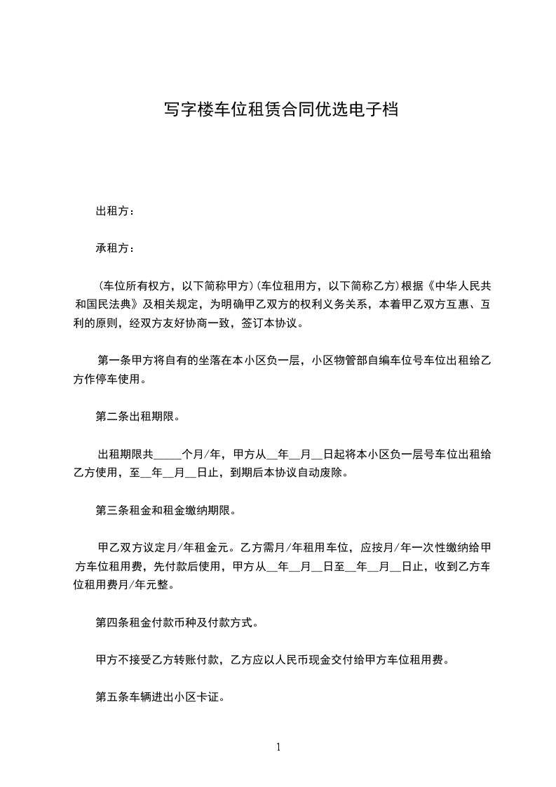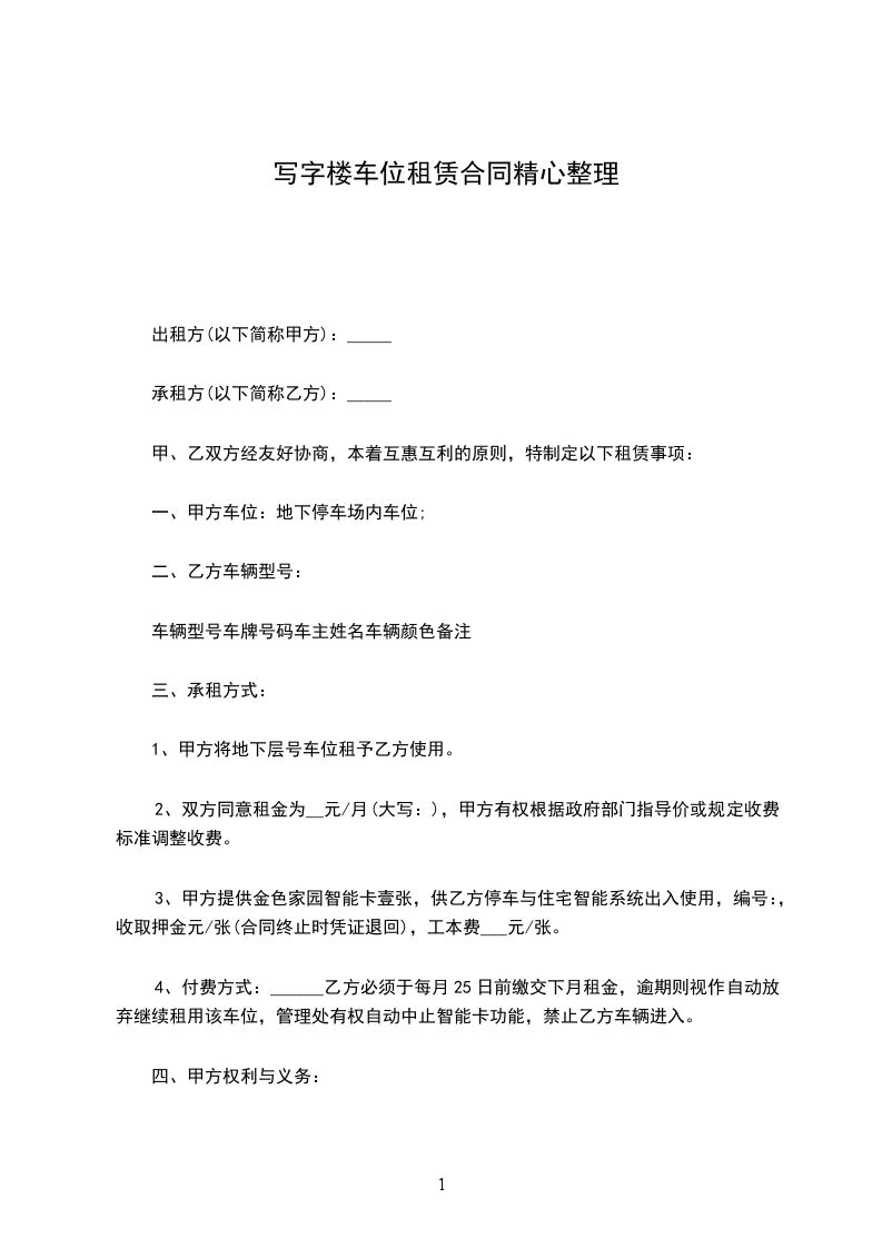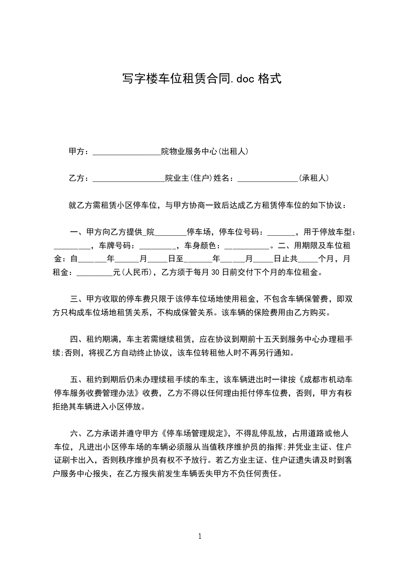 甲乙双方议定月/年租金元。乙方需月/年租用车位,应按月/年一次性缴纳给甲方车位租用费,先付款后使用,甲方从__年__月__日至__年__月__日止,收到乙方车位租用费月/年元整。