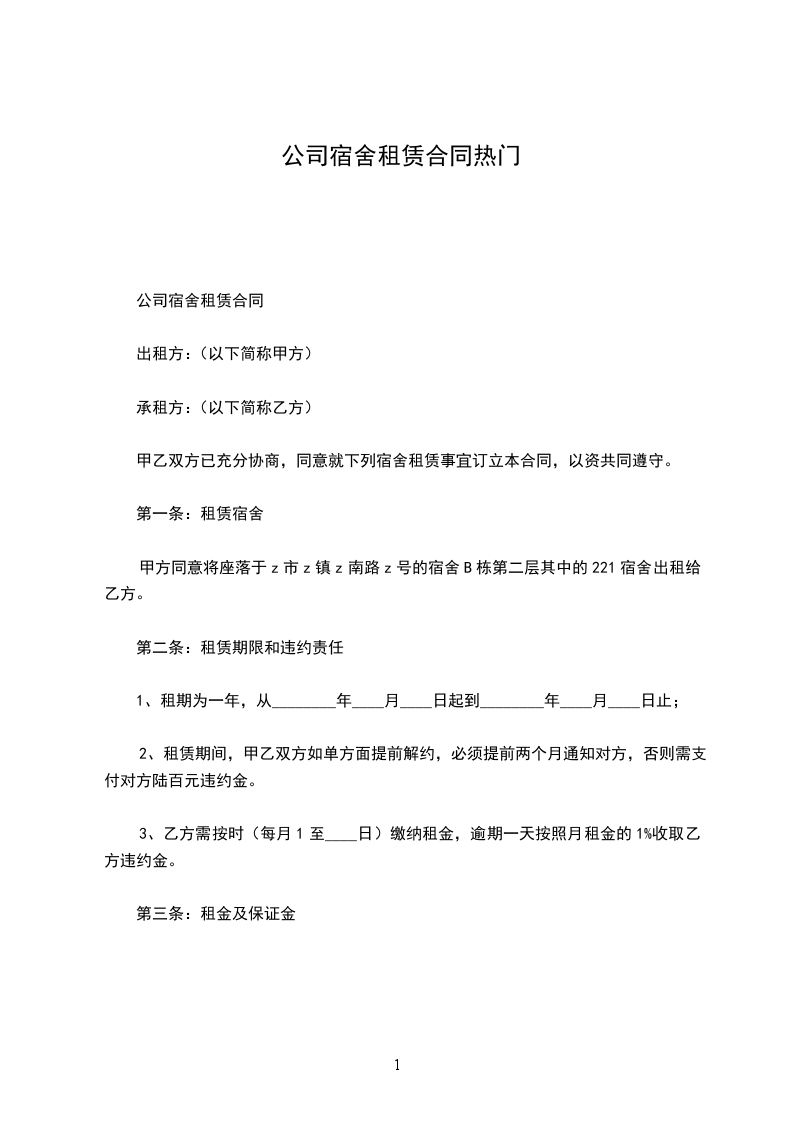 一、甲方将______市______镇______村厂房宿舍租赁给乙方使用,面积约____平方米。