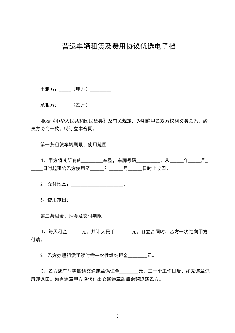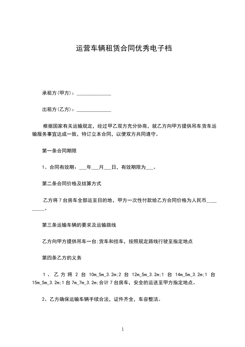 1、甲方将其所有的_________车型,车牌号码__________,从______年_____月______日时起租给乙方使用至______年______月______日时止收回。
