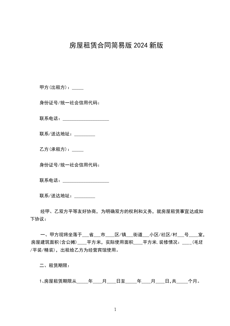 一、甲方现将坐落于___省___市____区/镇___街道___小区/社区/村___号____室,房屋建筑面积(含公摊)____平方米,实际使用面积____平方米,装修情况:____(毛坯/平装/精装),出租给乙方为经营宾馆使用。